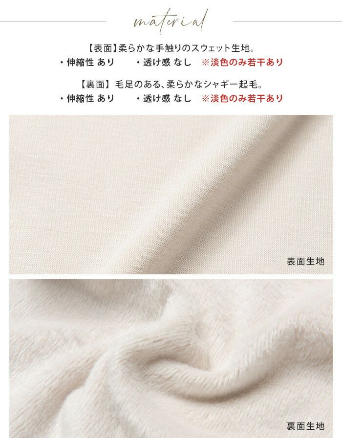 ふわっとした優しい肌触りの裏シャギー生地を使用し、脚部分もあったか。
