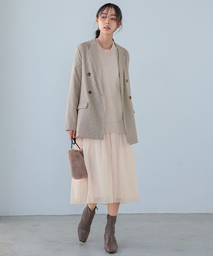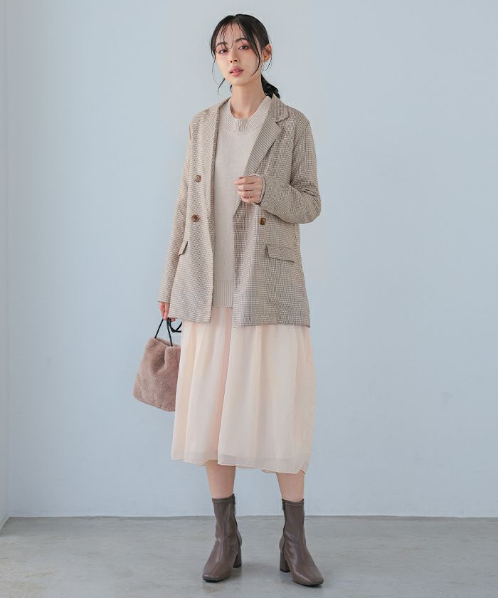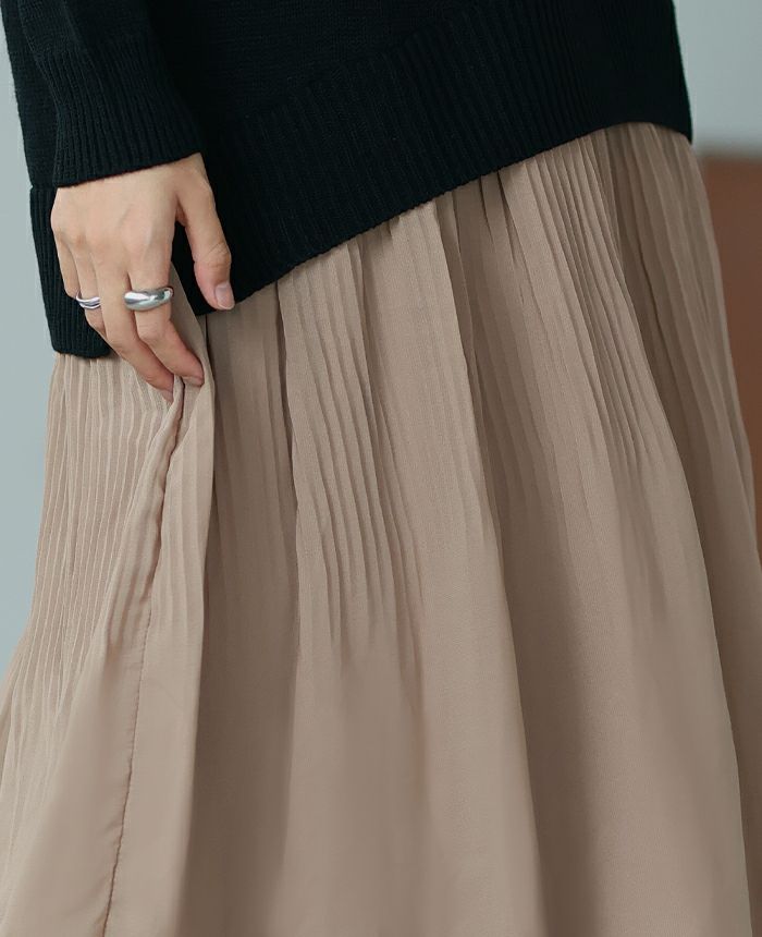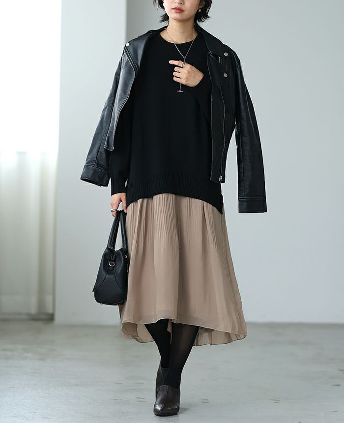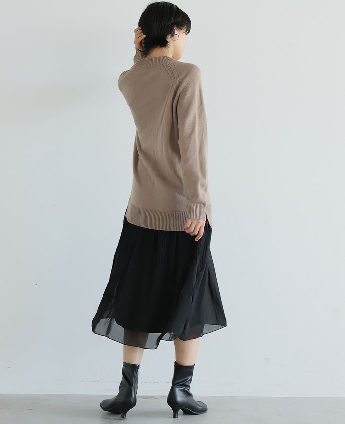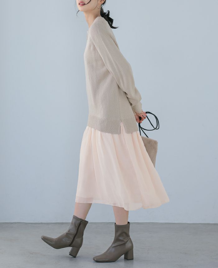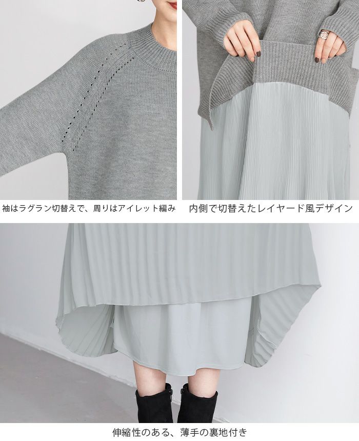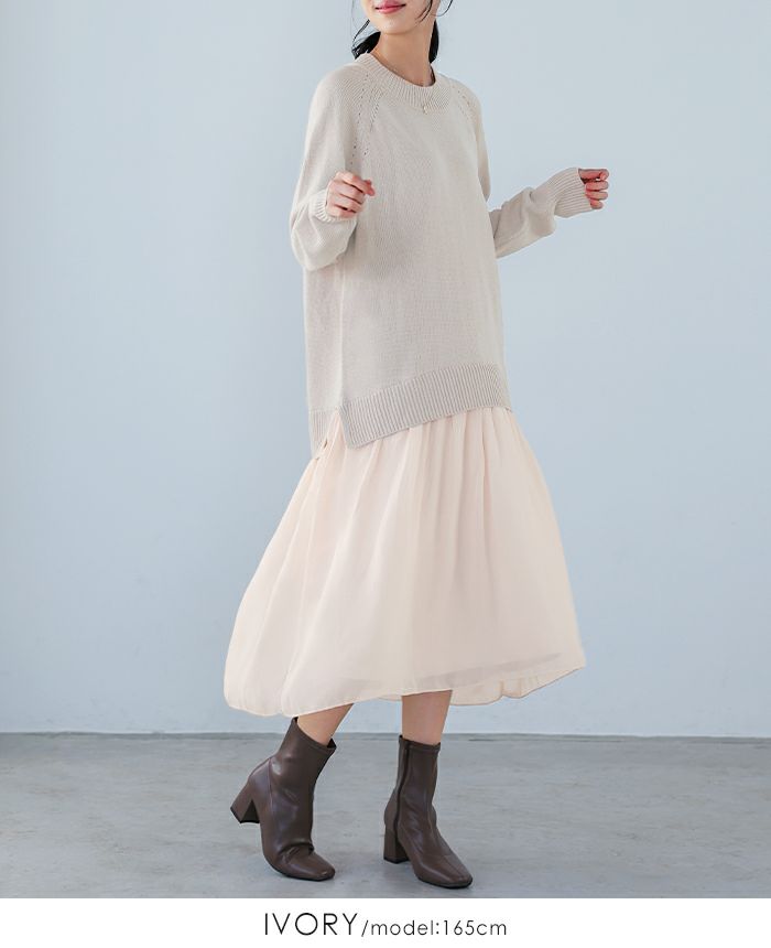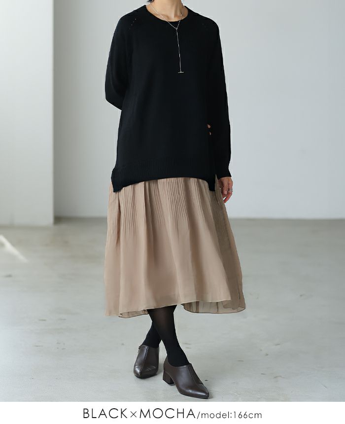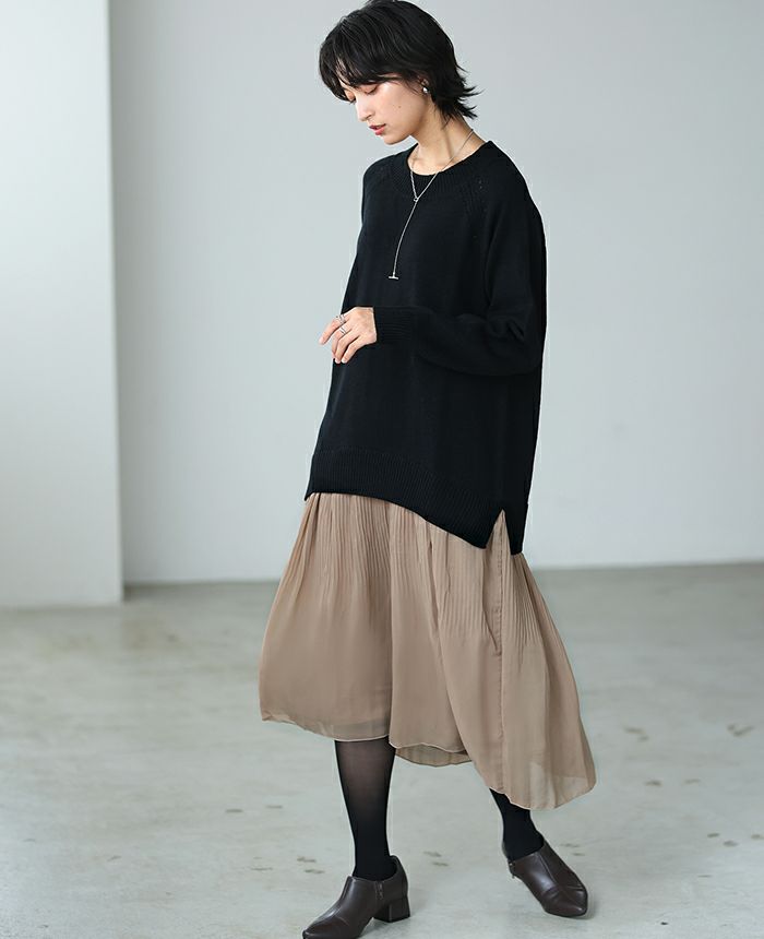 『シンプルニット+レディなスカート。』時間がない時もさっと着れてオシャレに見える、ドッキングワンピース。ゆったりとした長めのニットと、軽やかなシフォンのプリーツスカートとの組み合わせ。まるでコーディネートしたようなデザインで、手抜き感ゼロ。プリーツは上が細かく、下は消しプリーツで表情豊かな仕上がり。1枚でサマになる、大人可愛いアイテムです。