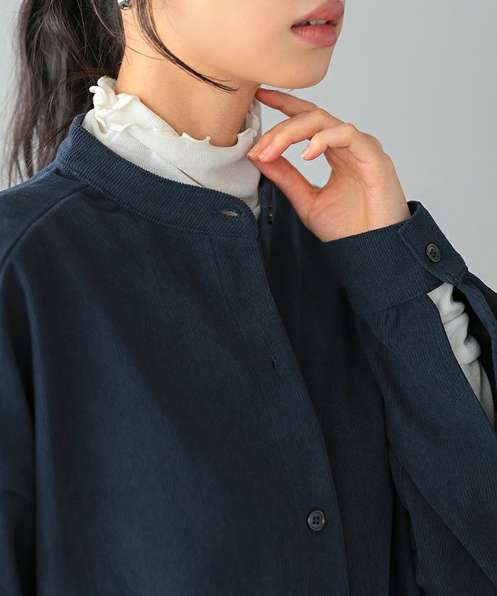 こなれ感たっぷりな、コーデュロイのシャツワンピ。ネックはバンドカラーで、顔周りがスッキリ見えるデザイン。ゆったりとしたシルエットと、伸縮性があるので着心地抜群。生地はボンディングなのであたたかく、しっかりとした厚みのある生地で透け感なし。羽織りとしてもお使いいただける、着回しやすいアイテムです。