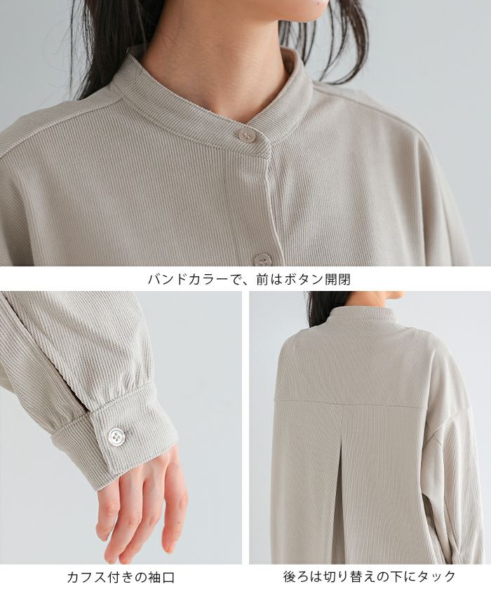 ネックはバンドカラーで、顔周りがスッキリ見えるデザイン。