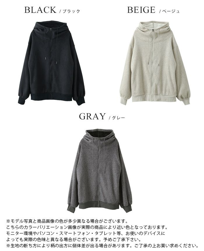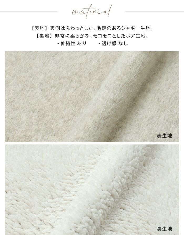 表は毛足のあるシャギー生地で、裏がボアになったパーカー。ふわふわとした柔らかなボアが、寒さから守ってくれます。ゆったりとしたシルエットで着やすく、どんな物とも重ね着しやすいデザイン。高めのハイネックは、首元もしっかりカバーしてくれます。お出掛けだけでなく、お家時間にも活躍してくれるおすすめアイテムです。