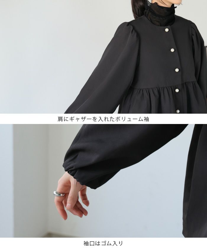 肩に丸みを出したボリュームスリーブは、袖口にゴムを入れてふっくらさせたデザイン。