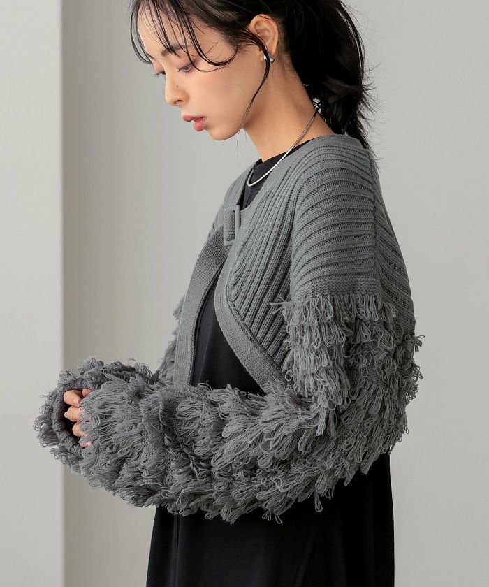動くたびに揺れるフリンジが特徴のボレロ。