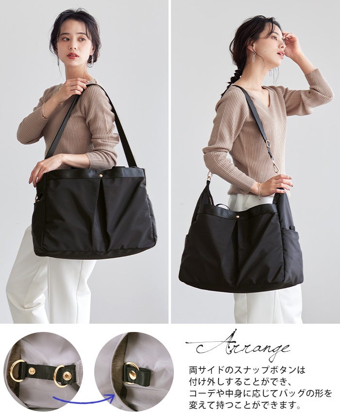 両サイドのスナップボタンで、バッグの形を変えることが可能。