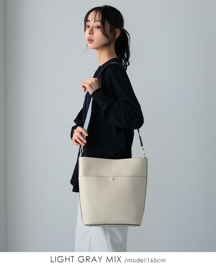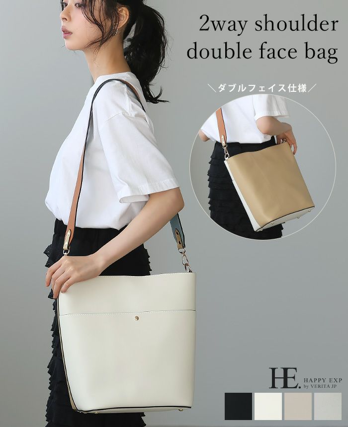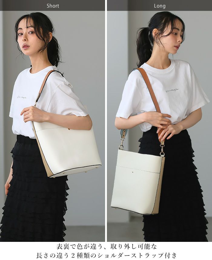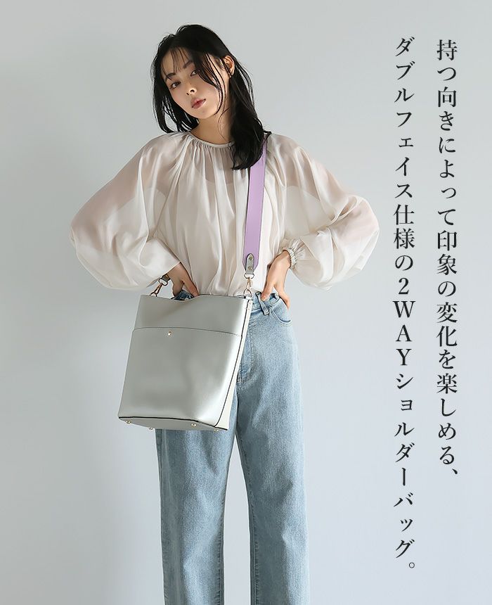 『これ1つで印象が大きく変わる。』上品に持てる、大人女子の為の2WAYショルダーバッグ。両面使えるダブルフェイス仕様で、1つで2つの配色が楽しめます。見た目はコンパクトながら、B5サイズが入るサイズ感。外側にはオープンポケットが1つあり、小物整理にも便利です。長さの違う2種類のショルダーストラップは取り外し可能。自分用にはもちろん、プレゼントにもおすすめです。
