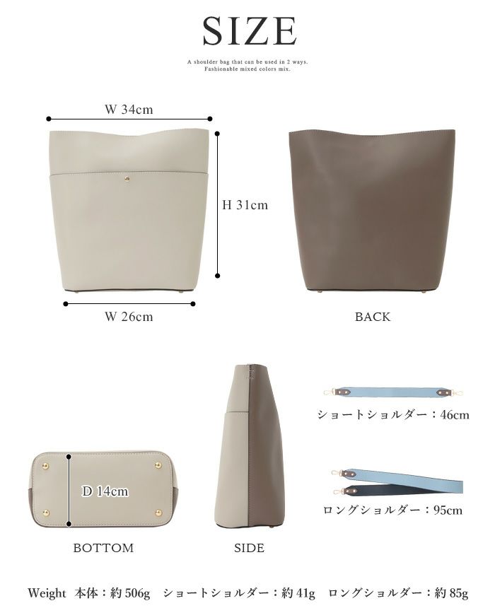 幅(W) 34/26 高さ(H) 31 マチ(D) 14 ショートショルダーストラップ 46 ロングショルダーストラップ 95