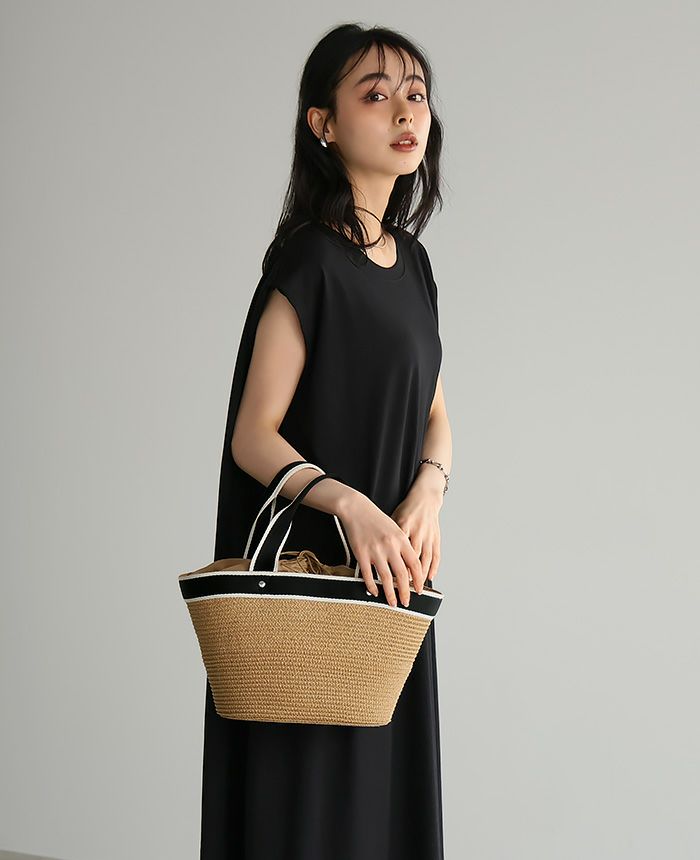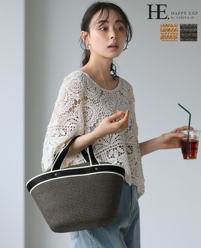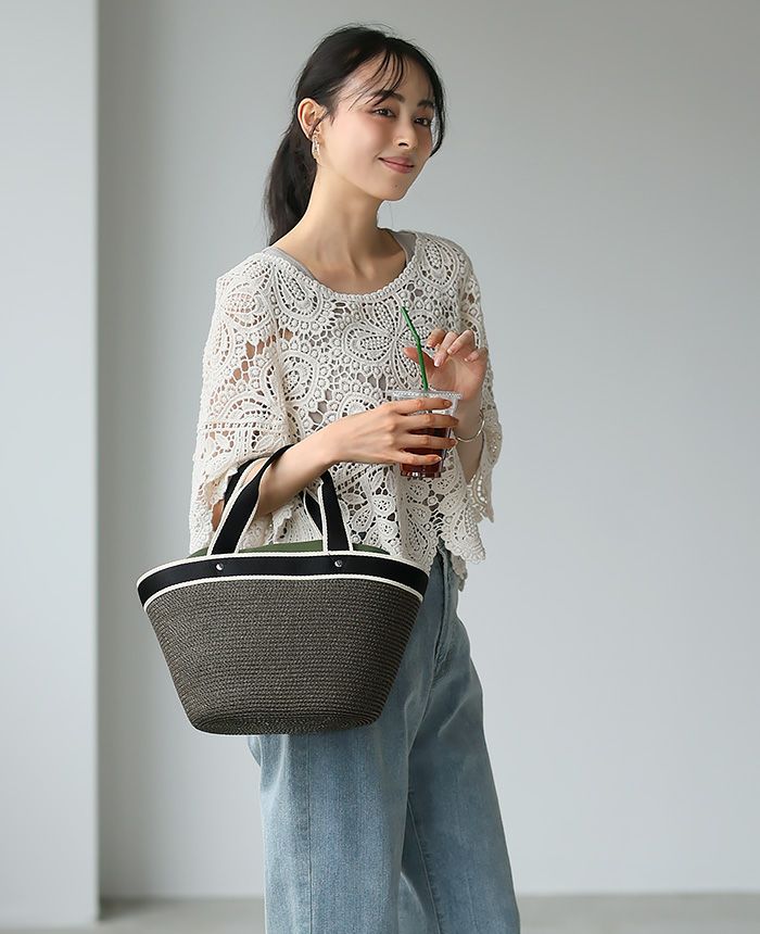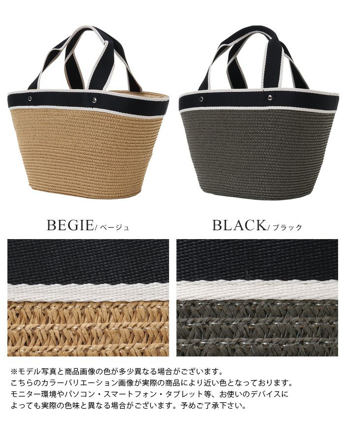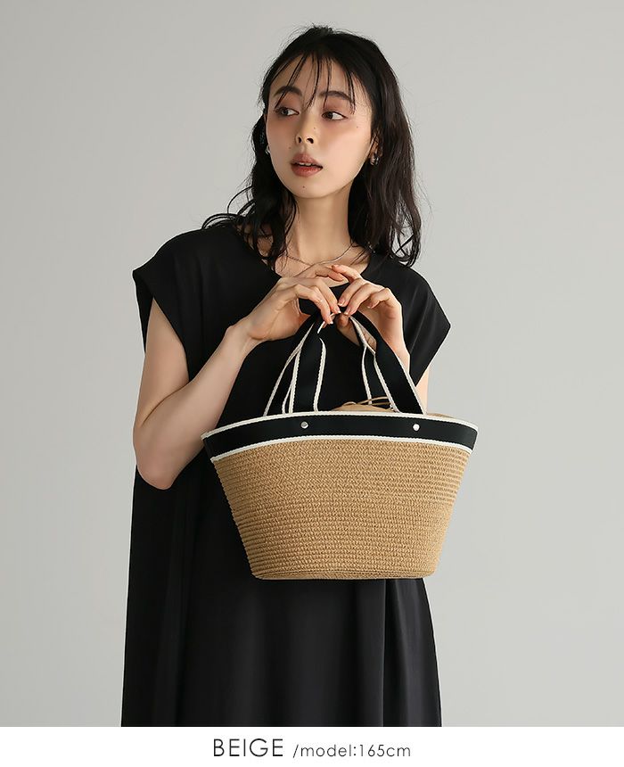 ペーパー素材と異素材を組み合わせた、雑材トートバッグ。マチがあるので身の回りの必需品だけでなく、夏に欠かせない荷物もしっかり収納◎ベージュとブラックは、配色テープで上品にトリミング。シルバーは同色のラメ入りテープを使い、スタイリングを明るくしてくれます。