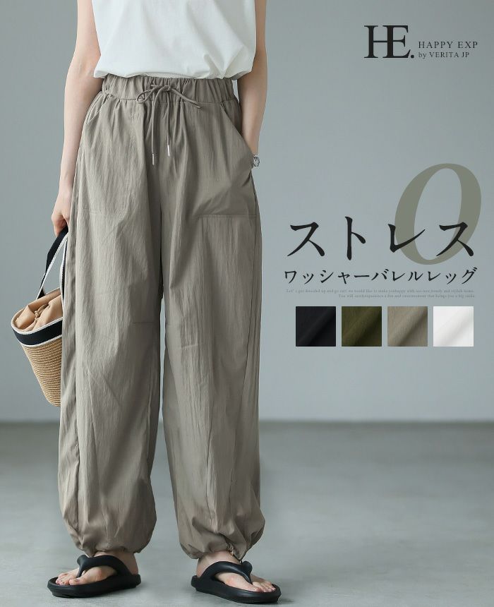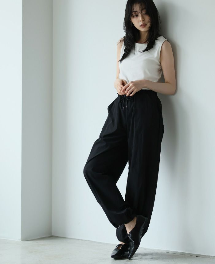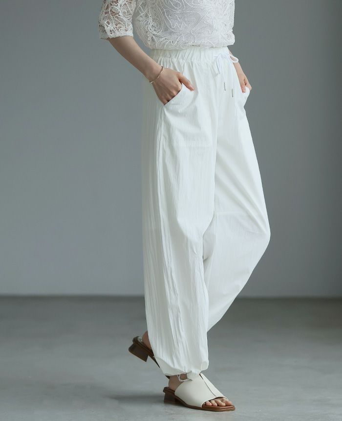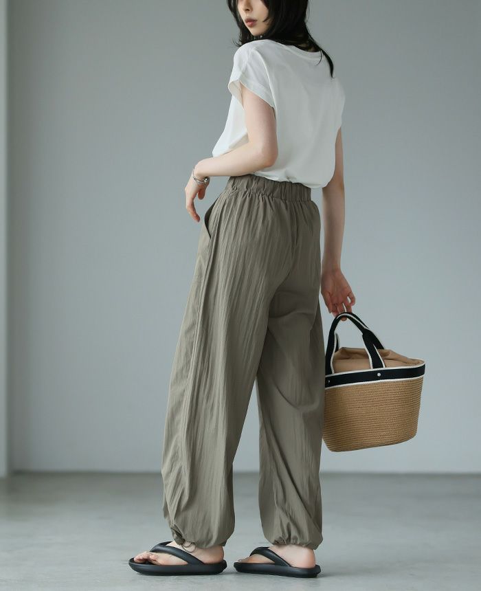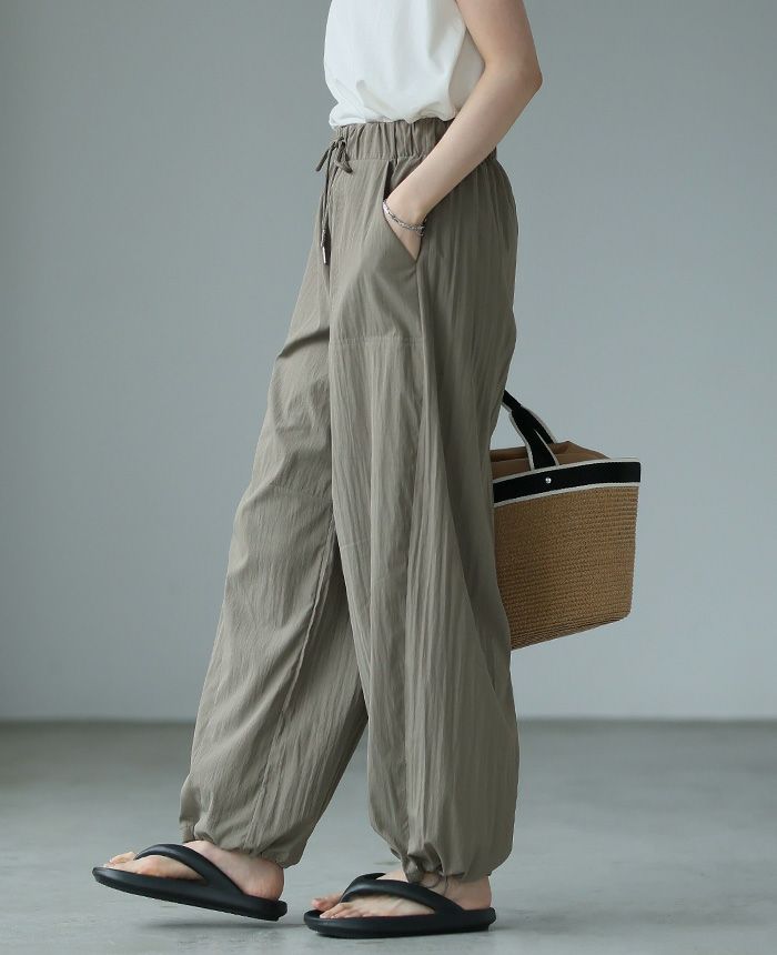 旬のコーデに仕上げてくれるバレルレッグパンツ。ゆったりとしたシルエットで、裾のドロストでキュっと絞れるデザイン。脚のラインを拾わず、ゆるっと穿けるのがポイント。ウエストは総ゴムで、サイズ調整できる紐付き。シワ感のある生地が、こなれ感を演出してくれます。上品なツヤ感が大人っぽい、着回しやすいアイテムです。