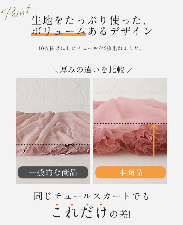 柔らかな、伸縮性のあるチュール ※生地を重ねたデザインの為、静電気が起きる場合は静電気防止スプレーをご使用ください。 |