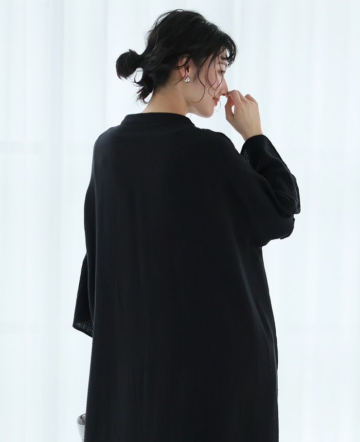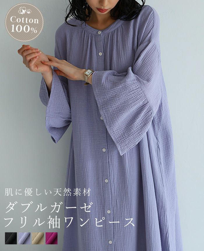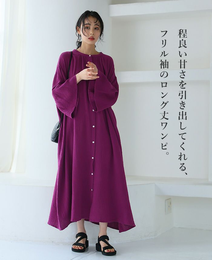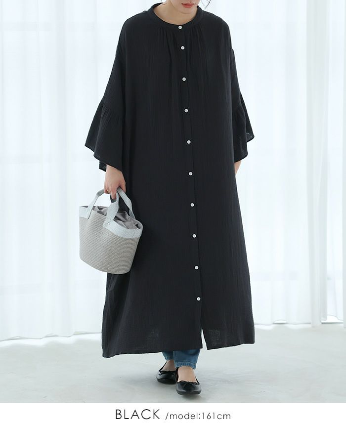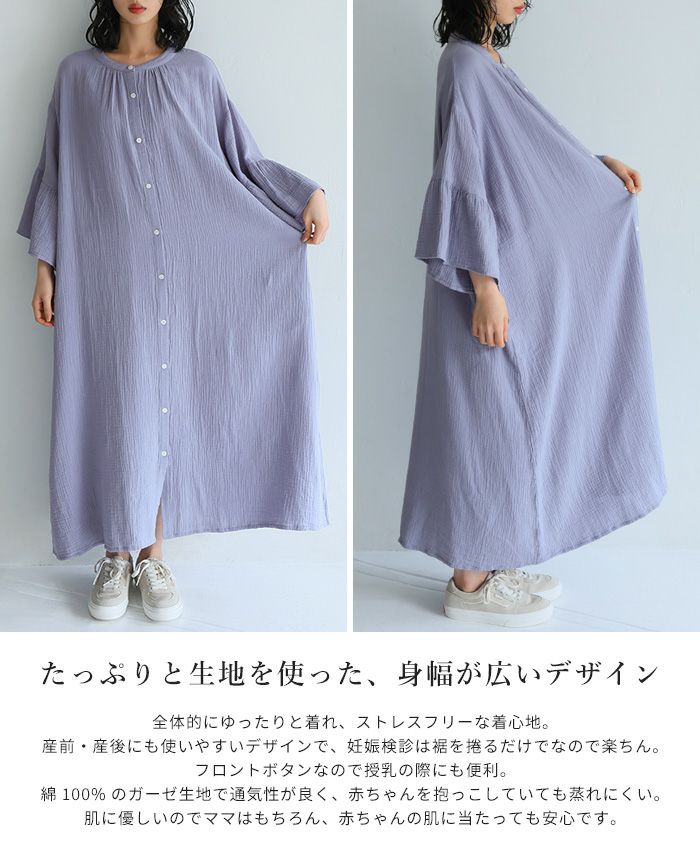 肌に優しい綿100%のダブルガーゼを使ったロングワンピ。袖口のフリルで甘さを出し、バンドカラーで引き締めたデザイン。フロントはボタン開閉で、羽織りとしてもアレンジ可能。たっぷりと生地を使っているので、マタニティとしても活躍してくれます。清涼感のある、普段使いにちょうどいいアイテムです。