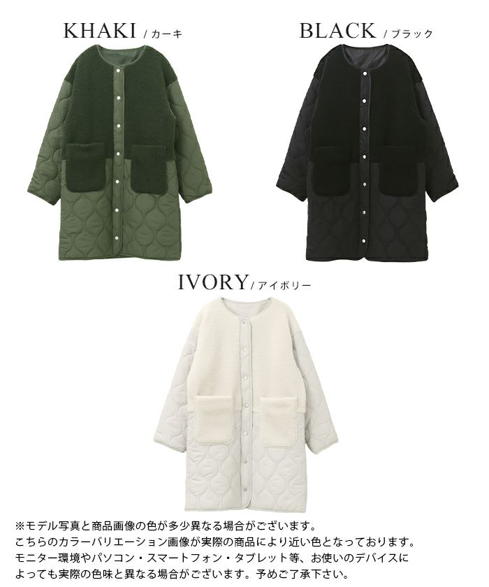 ボアとキルトを組み合わせた異素材のコート。丸みのあるひょうたんキルトで、女性らしい柔らかな印象に。フロントに付いた大きなボアポケットが甘さを引き出してくれます。軽くて暖かく、デイリーユースにピッタリ。寒い日のお出掛けも安心の、着回しやすいアウターです。