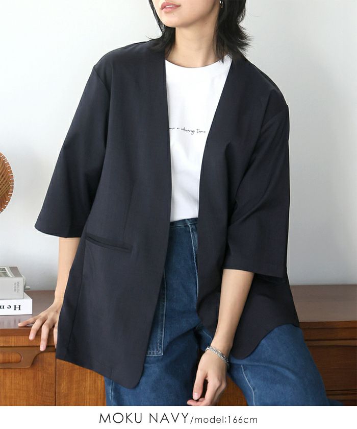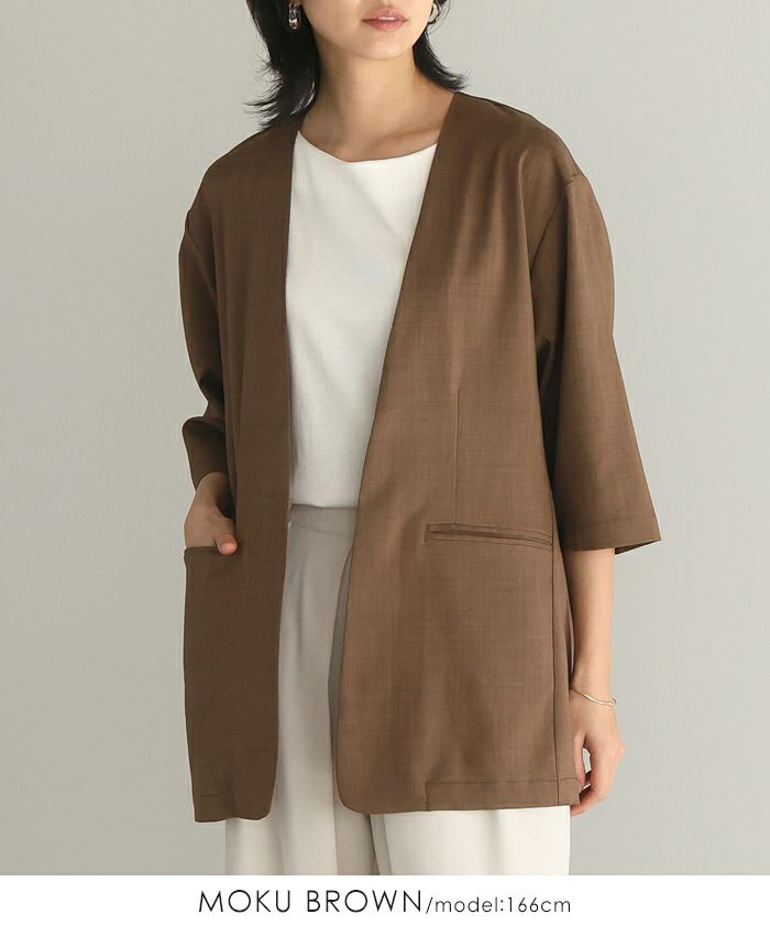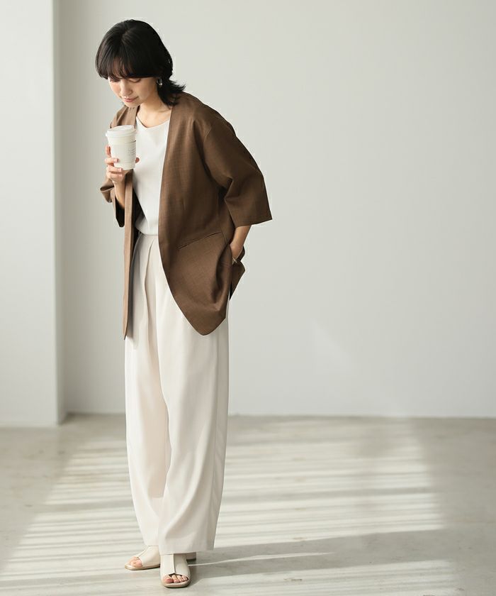『季節に合わせた素材選び。』麻のような風合いの、涼しげなノーカラージャケット。ボタンレスなので、さっと気軽に羽織れます。軽くて着心地が良く、シワになりにくいのがポイント。袖丈は少し長めの6分丈で、気になる二の腕がカバーできます。1枚は持っておきたい、カジュアルからきちんとした場まで使えるアイテムです。