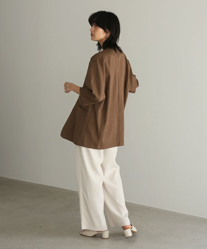 麻のような風合いの、涼しげなノーカラージャケット。