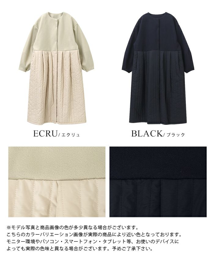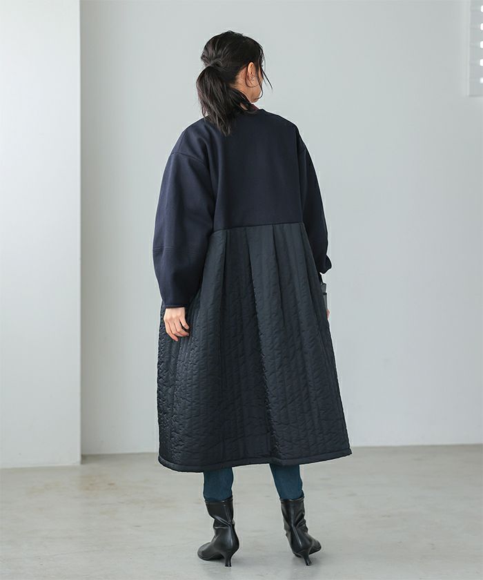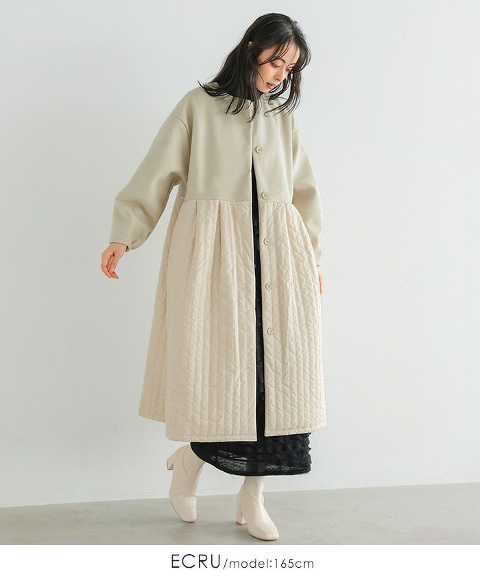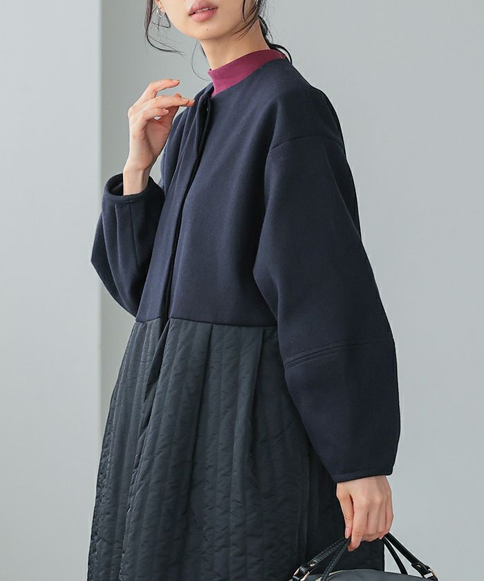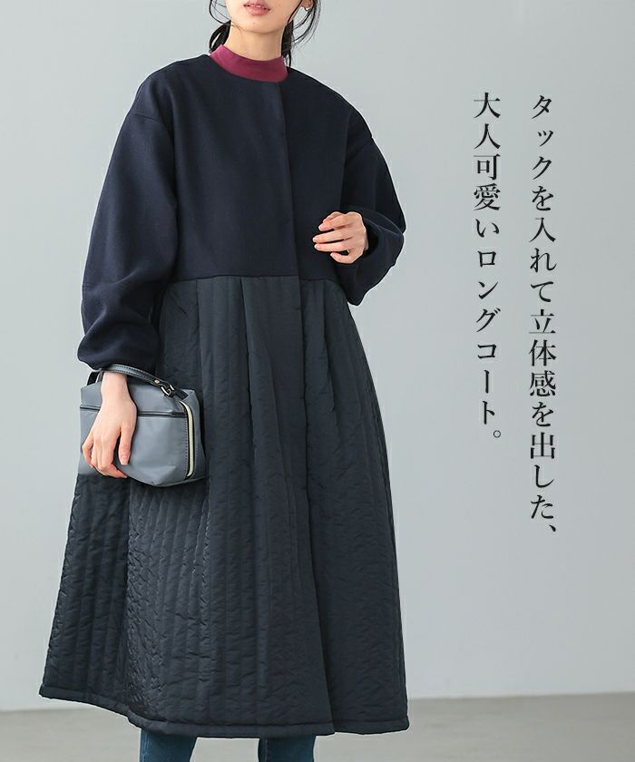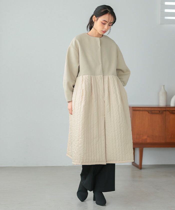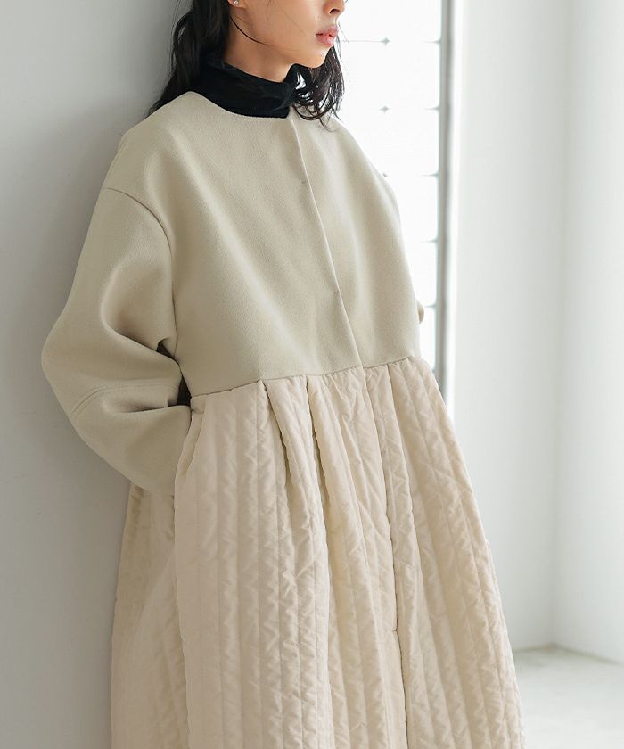 ふっくらとした丸みのあるシルエットが女性らしいコート。上部分はフェイクウール、下部分はキルト生地で切り替えたデザイン。切り替えと袖口にタックを入れ、ボリューム感アップ。フロントは比翼仕立てで、ボタンを隠してスッキリとさせました。大人っぽい可愛さが詰まった、キレイめアウターです。