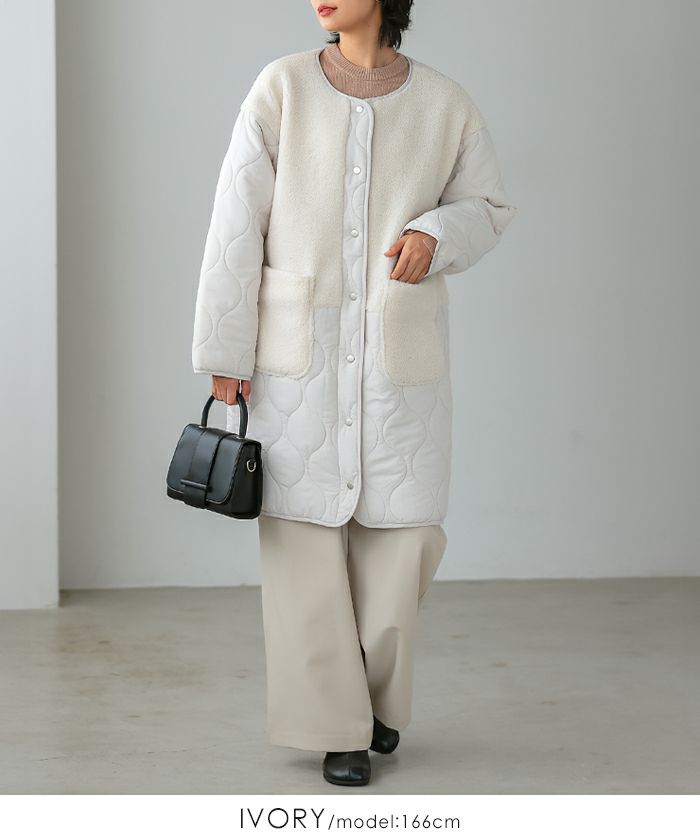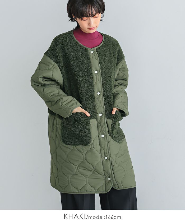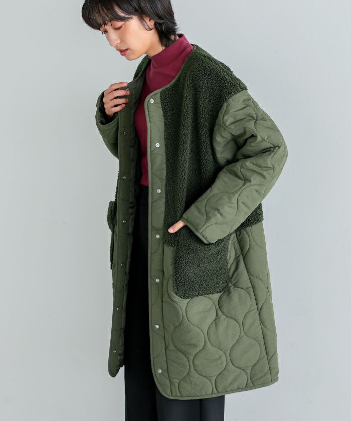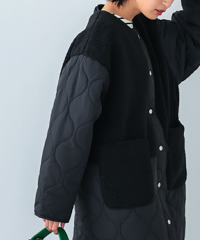 ボアとキルトを組み合わせた異素材のコート。丸みのあるひょうたんキルトで、女性らしい柔らかな印象に。フロントに付いた大きなボアポケットが甘さを引き出してくれます。軽くて暖かく、デイリーユースにピッタリ。寒い日のお出掛けも安心の、着回しやすいアウターです。