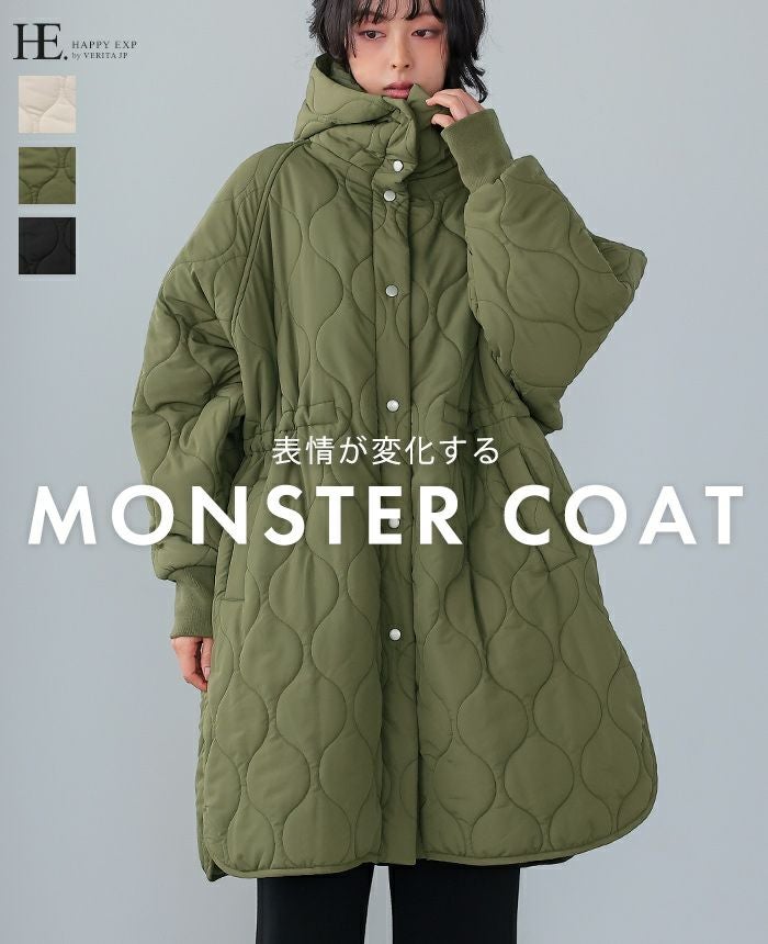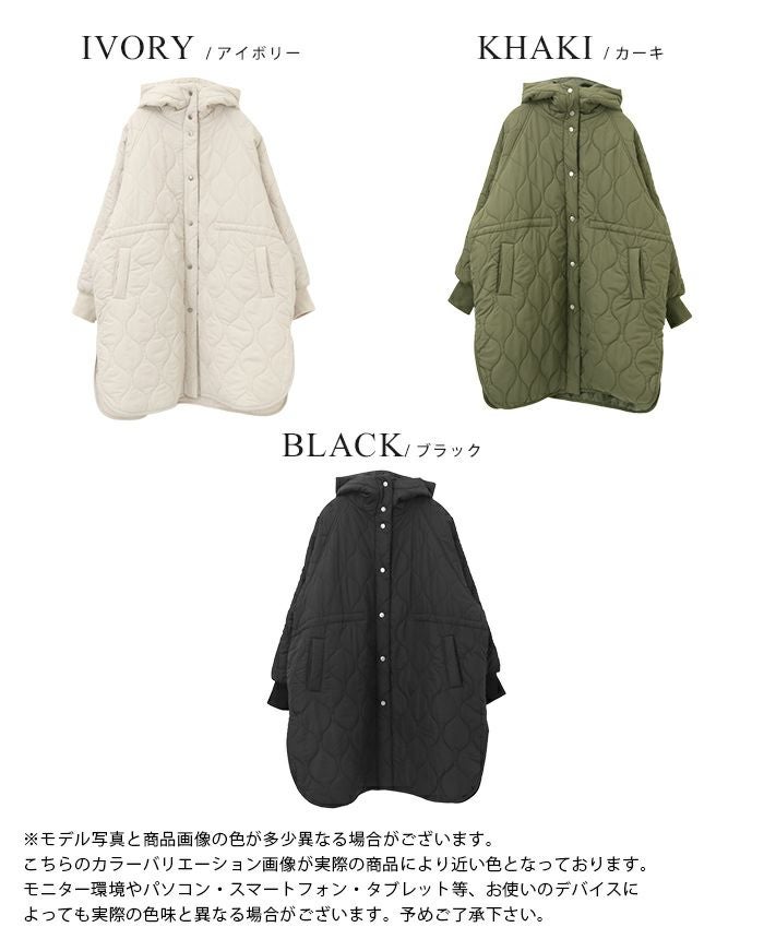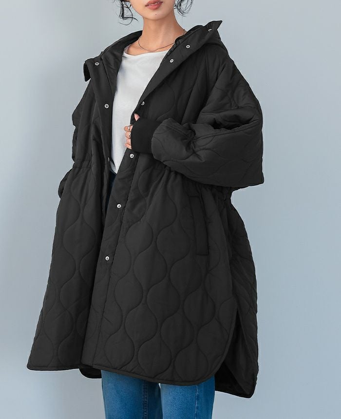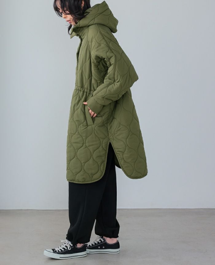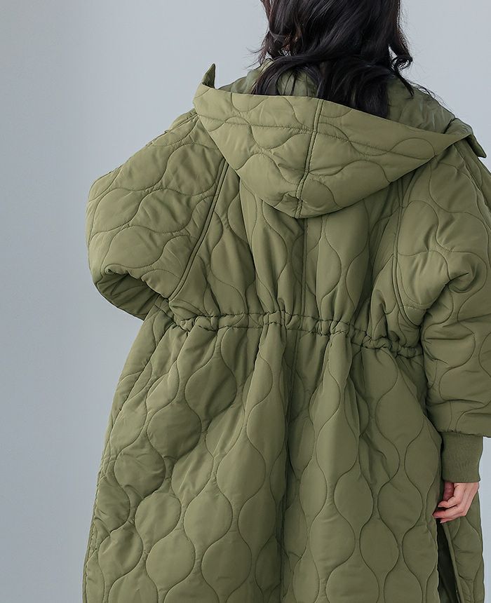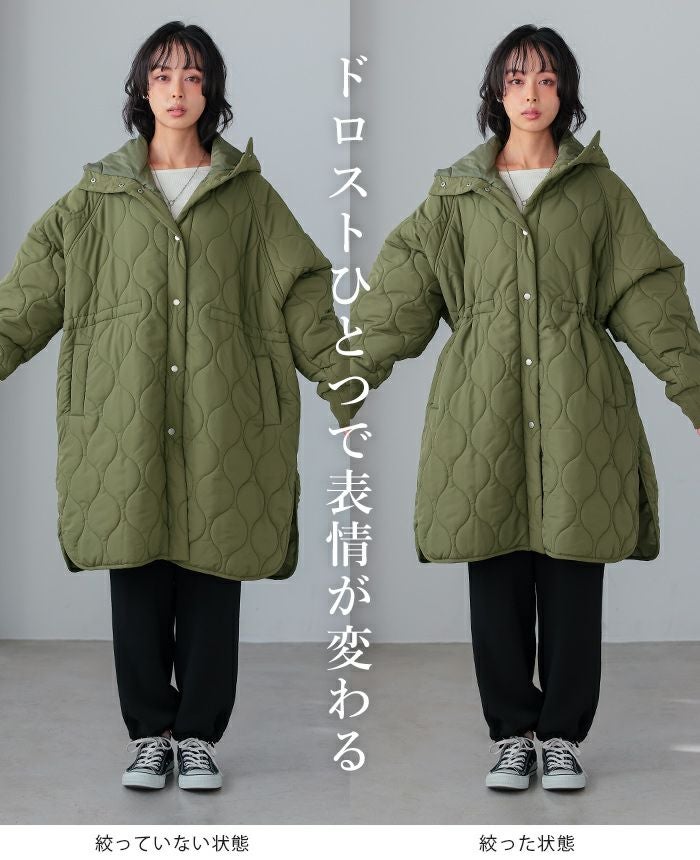 軽くてあたたかい着心地が魅力の、キルトフード付きコート。丸みのあるひょうたんキルトで、女性らしい柔らかな印象に。ウエスト内側のドロストを絞れば、メリハリのあるシルエットが完成。ボリュームのある袖は、袖口のリブでキュッと引き締めてスッキリ。サイドスリット入りで動きやすく、抜け感も叶うデザイン。寒い日のお出掛けに活躍してくれるアウターです。
