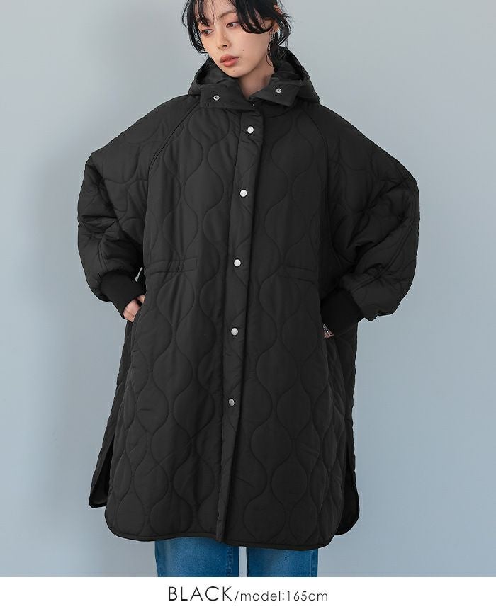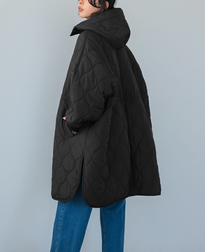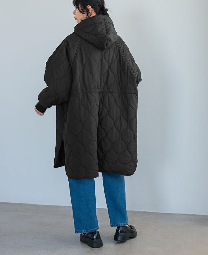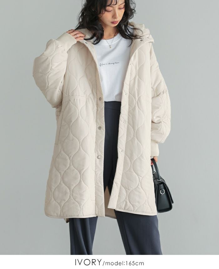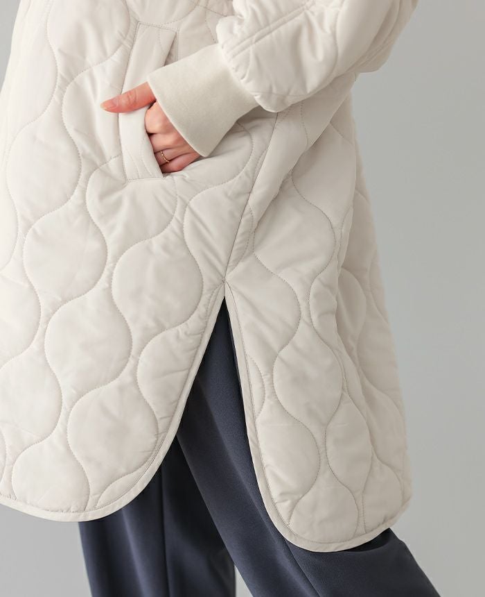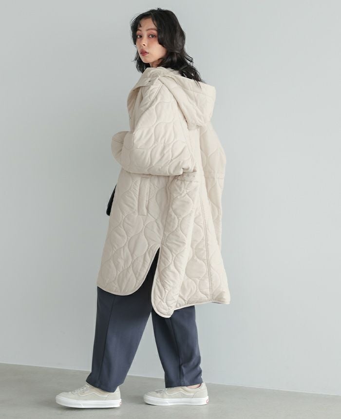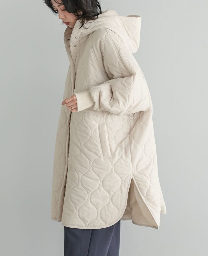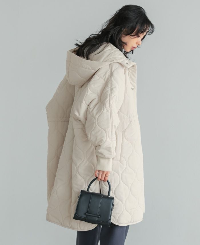軽くてあたたかい着心地が魅力の、キルトフード付きコート。