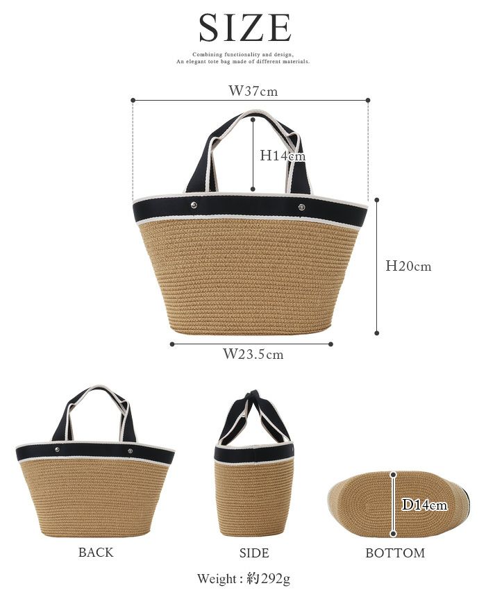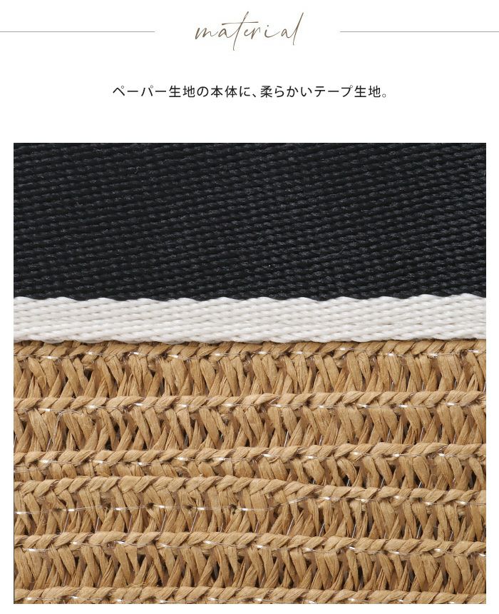 ペーパー素材と異素材を組み合わせた、雑材トートバッグ。マチがあるので身の回りの必需品だけでなく、夏に欠かせない荷物もしっかり収納◎ベージュとブラックは、配色テープで上品にトリミング。シルバーは同色のラメ入りテープを使い、スタイリングを明るくしてくれます。