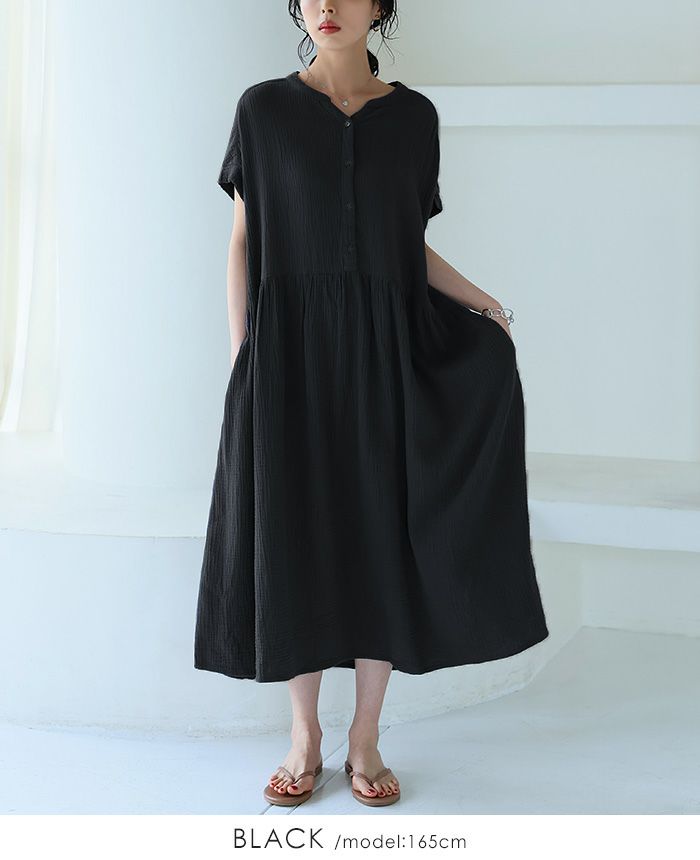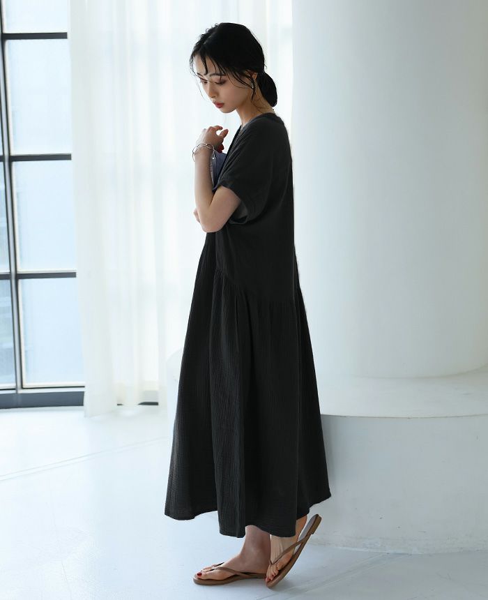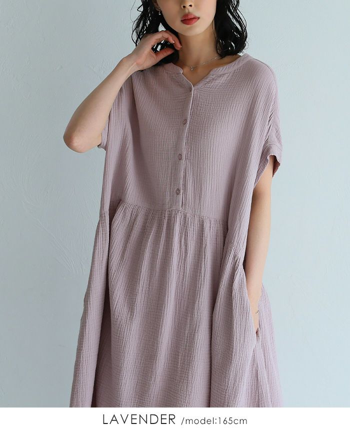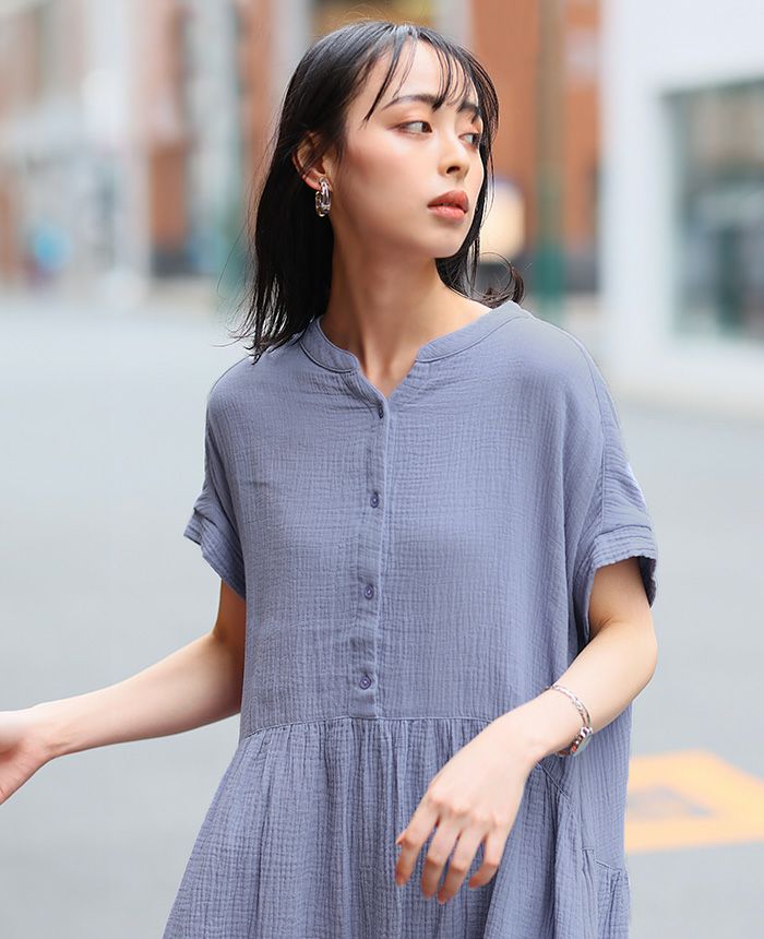 肌に優しい綿100%のダブルガーゼを使ったワンピース。ゆったりとしたシルエットで、ストレスフリーな着心地。ウエストの切替えにはギャザーを入れ、甘い雰囲気に。ボトムと合わると、今どきコーデが完成。清涼感のある、デイリーアイテムです。