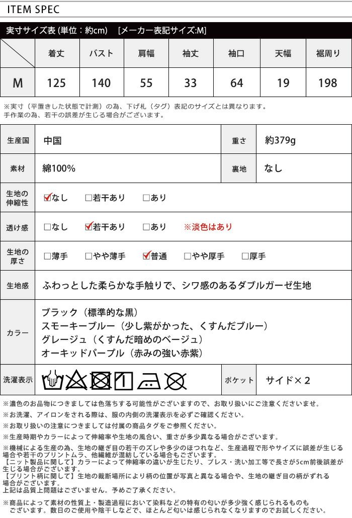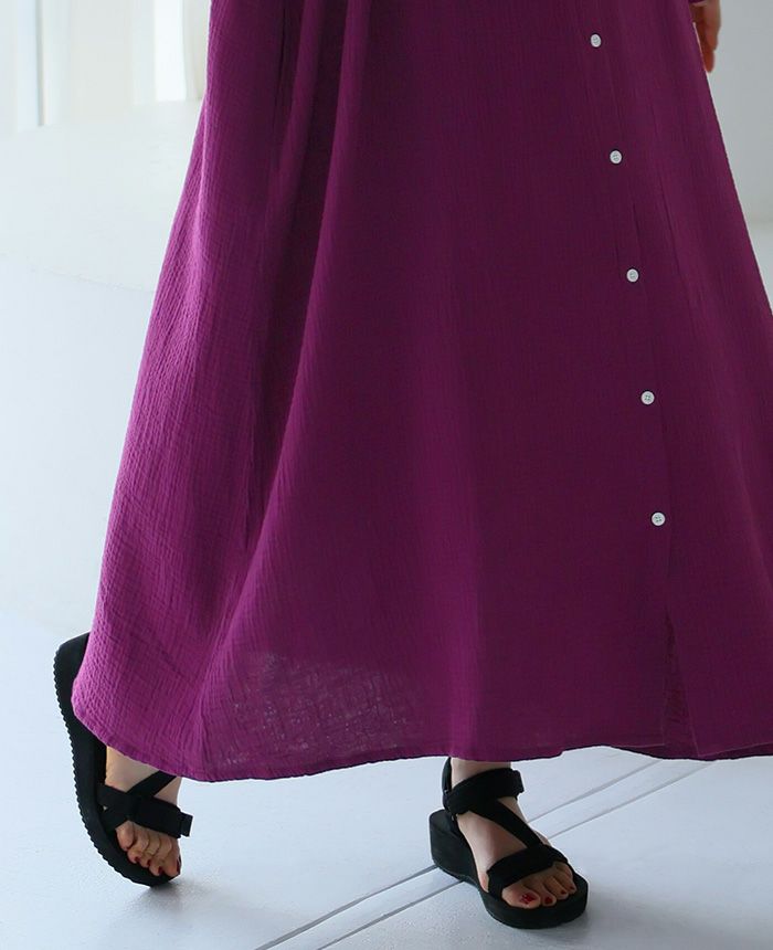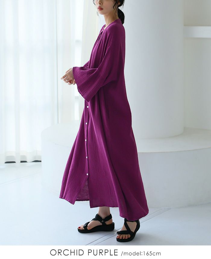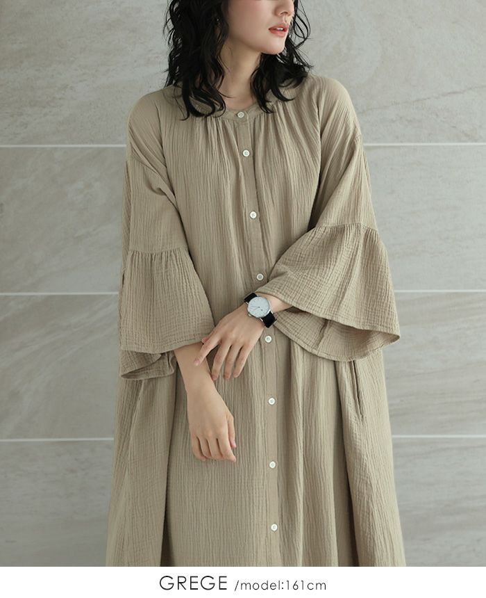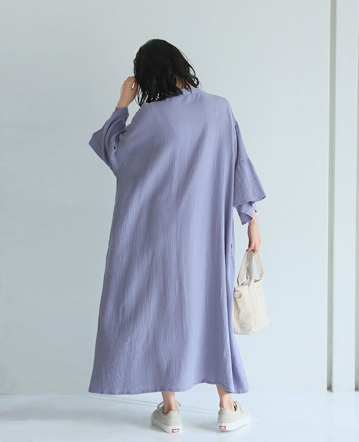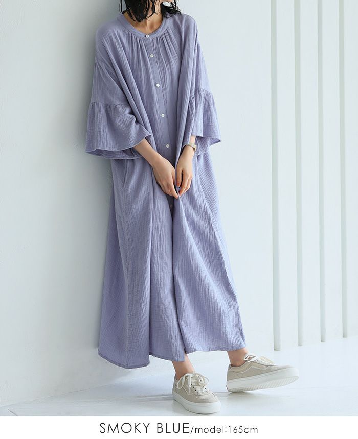肌に優しい綿100%のダブルガーゼを使ったロングワンピ。袖口のフリルで甘さを出し、バンドカラーで引き締めたデザイン。フロントはボタン開閉で、羽織りとしてもアレンジ可能。たっぷりと生地を使っているので、マタニティとしても活躍してくれます。清涼感のある、普段使いにちょうどいいアイテムです。