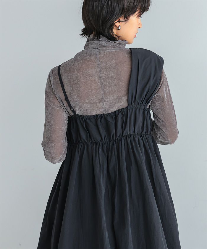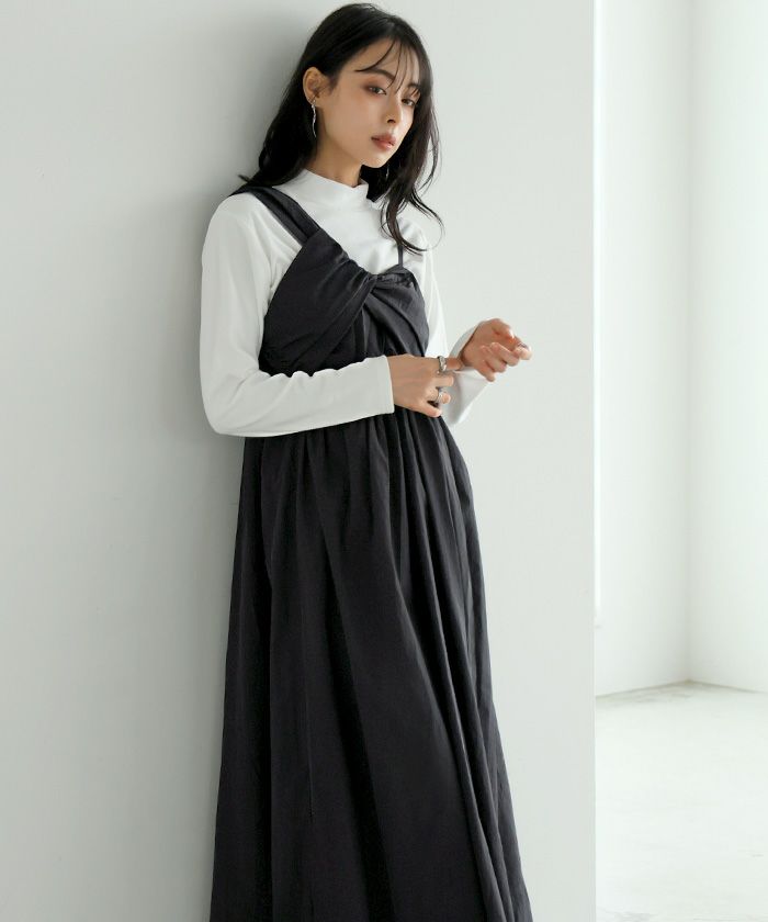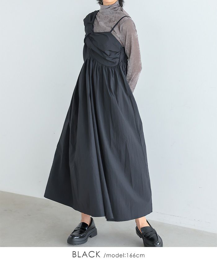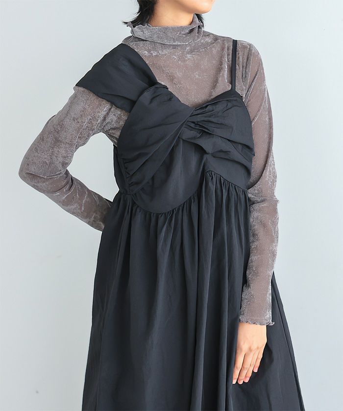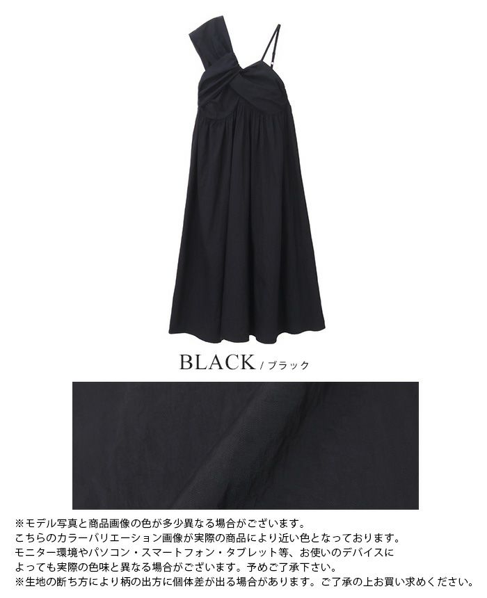 左右で印象が異なる、アシンメトリーのワンピース。クシュっとした生地をツイストさせ、デザイン性を高めました。左はキャミストラップで、長さ調整が可能。背中部分がゴムなので簡単に着用でき、程よいフィット感があります。非常に軽くて汚れにくいナイロン素材は、お手入れがしやすいのがポイント。洗練されたコーデに導いてくれるアイテムです。