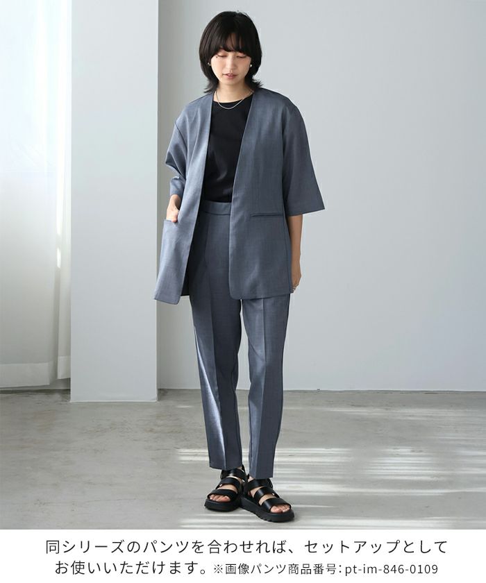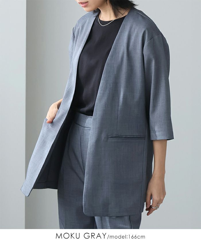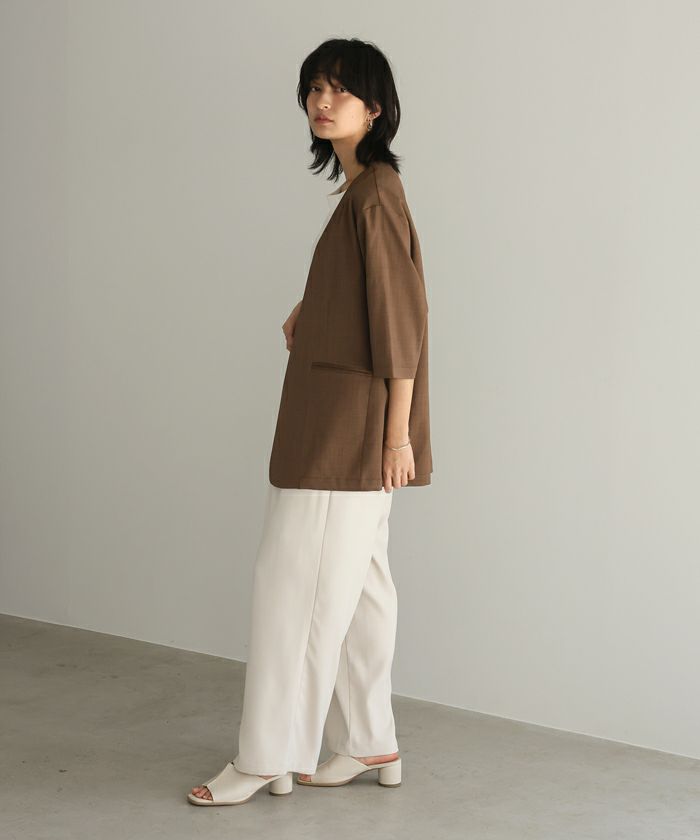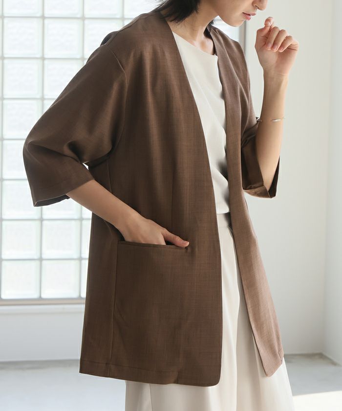 『季節に合わせた素材選び。』麻のような風合いの、涼しげなノーカラージャケット。ボタンレスなので、さっと気軽に羽織れます。軽くて着心地が良く、シワになりにくいのがポイント。袖丈は少し長めの6分丈で、気になる二の腕がカバーできます。1枚は持っておきたい、カジュアルからきちんとした場まで使えるアイテムです。