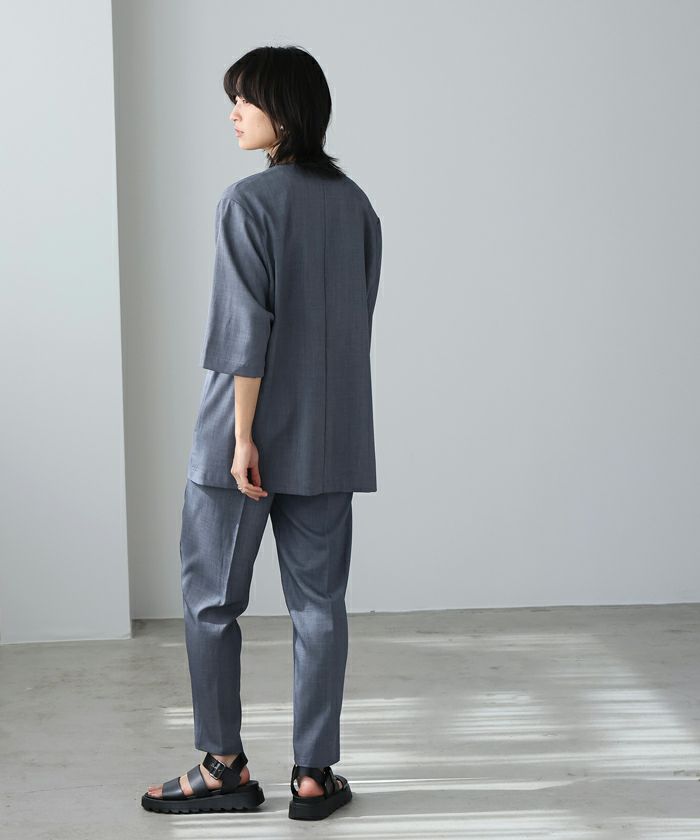 麻のような風合いの、涼しげなノーカラージャケット。