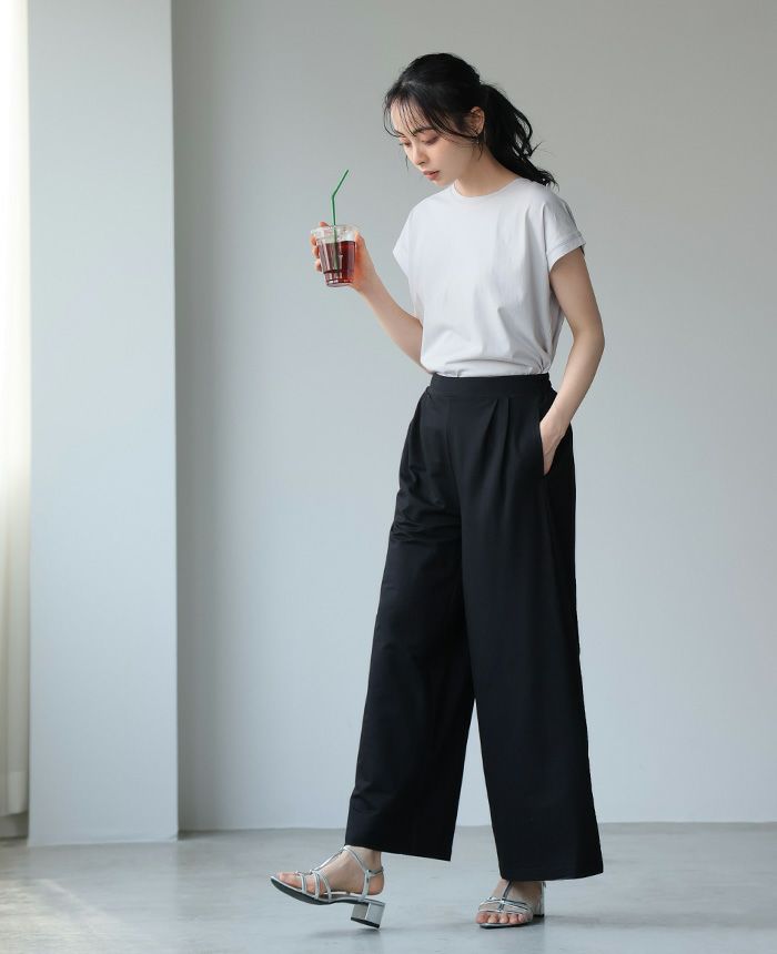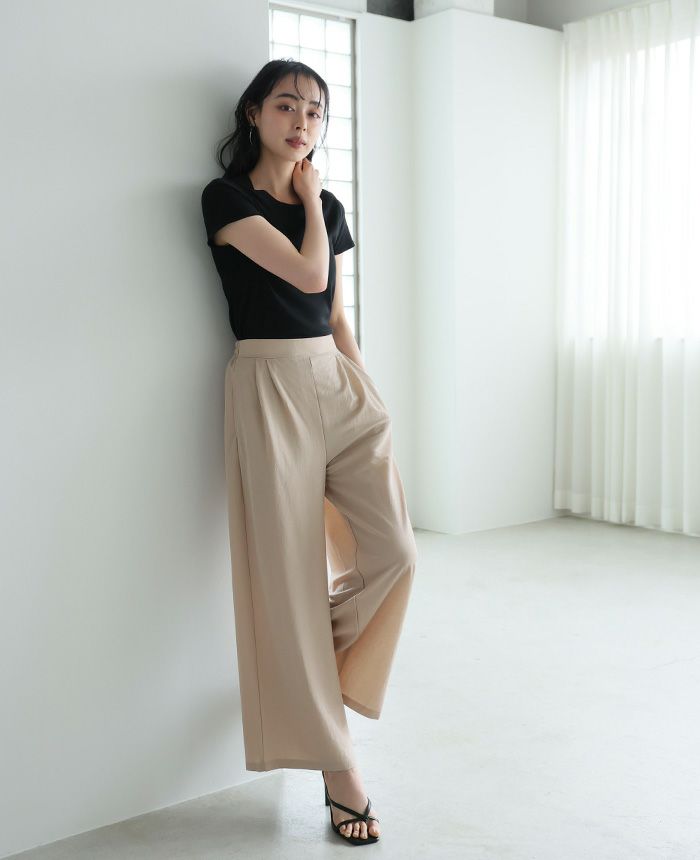 『暑い季節を快適に、接触冷感生地。』 着た瞬間、ひんやりと涼しい着心地が実感できるパンツ。ワイドなシルエットで、脚のラインが出ないデザイン。前ウエストはインしても決まるフラットで、後ろはゴムで楽な穿き心地。どんなアイテムとも合わせやすいシンプルなデザイン。お出掛けが楽しくなる、おすすめの1枚です。