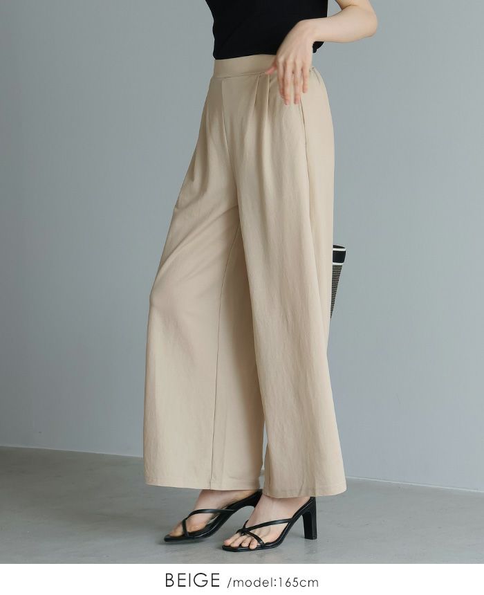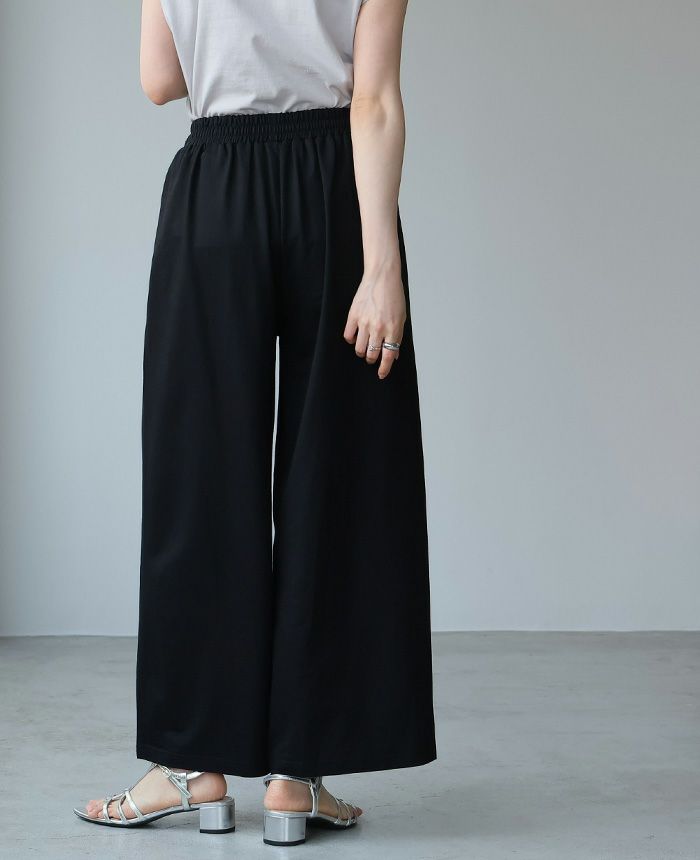 『暑い季節を快適に、接触冷感生地。』着た瞬間、ひんやりと涼しい着心地が実感できるパンツ。ワイドなシルエットで、脚のラインが出ないデザイン。前ウエストはインしても決まるフラットで、後ろはゴムで楽な穿き心地。どんなアイテムとも合わせやすいシンプルなデザイン。お出掛けが楽しくなる、おすすめの1枚です。