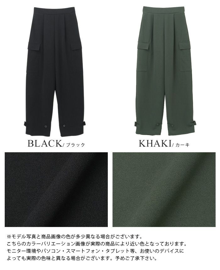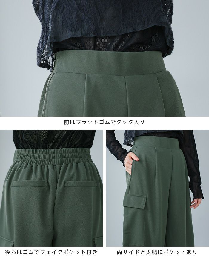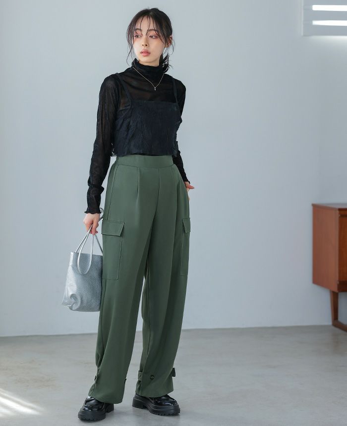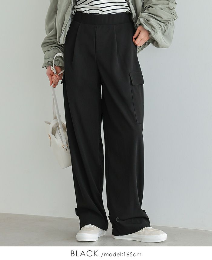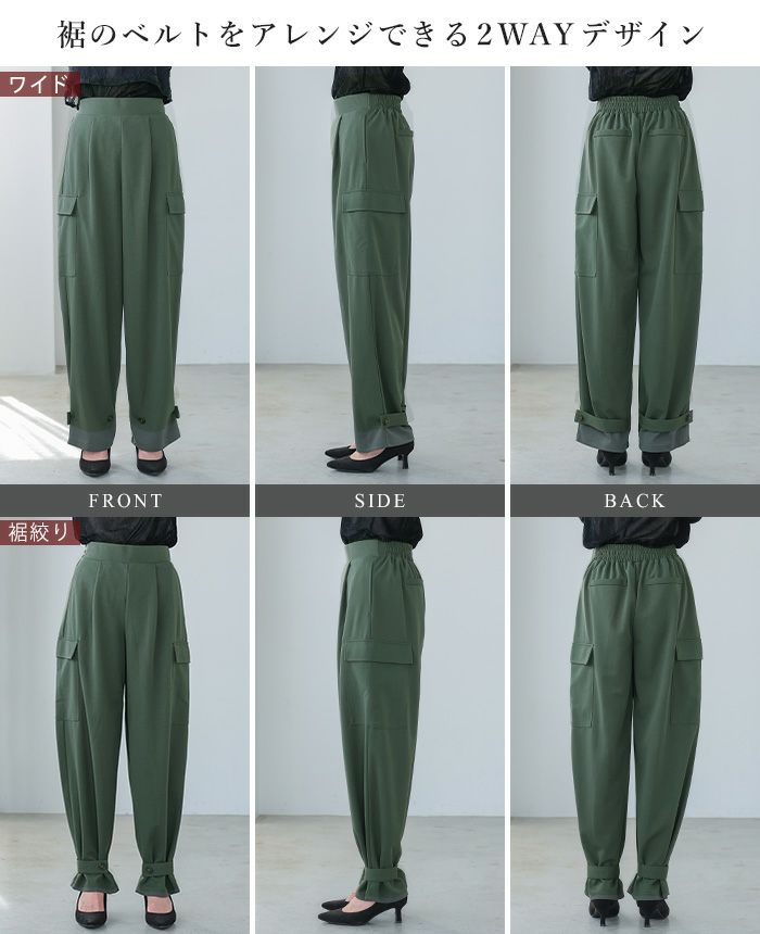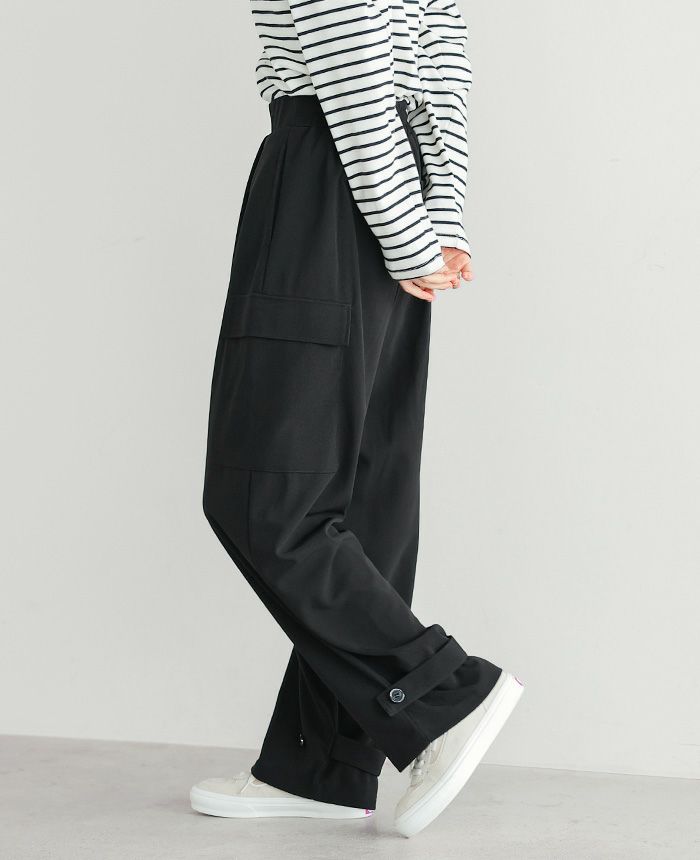 『1枚で2つのシルエットを楽しむ。』サイドのポケットがポイントの、ゆったりシルエットのカーゴパンツ。裾はベルトとボタン2つ付きで、留める位置でシルエットが変わる2wayデザイン。前ウエストはフラットゴムなのでスッキリ見え、トップスをインにしてもサマになります。落ち感のある梨地生地は伸縮性があり、上品で大人っぽい印象。こなれ感たっぷりな、大人のカジュアルアイテムです。