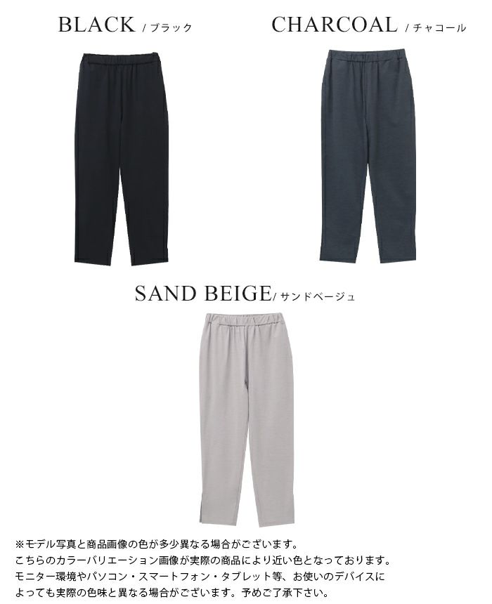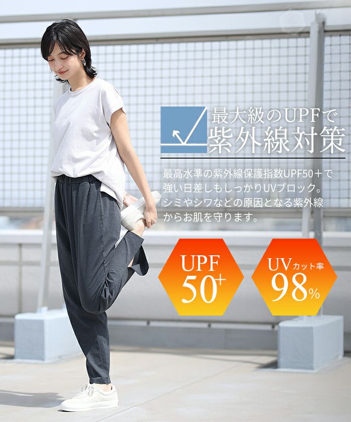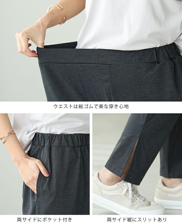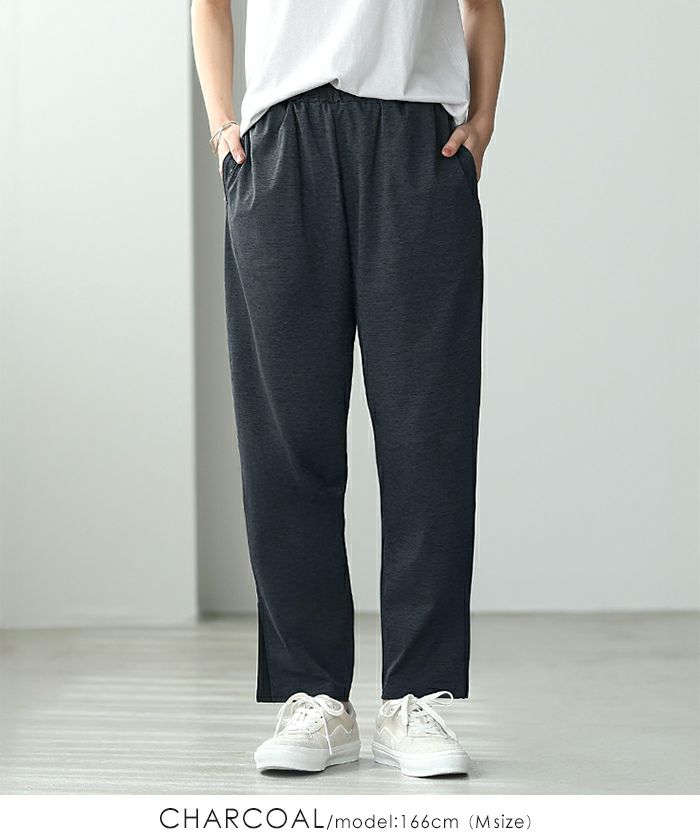 『汗ばむ季節に嬉しい機能性アイテム!』汗をかいてもすぐに乾く、ドライタッチシリーズ。紫外線カットや接触冷感の機能付きで、スポーツやお出掛けも安心。テーパードよりゆるっとしたシルエットの、フルレングス丈のパンツ。裾はスリット入りで、抜け感のあるデザイン。ウエストは総ゴムで穿きやすく、両サイドにはポケット付き。1枚は持っておきたい、おすすめのアイテムです。