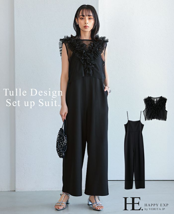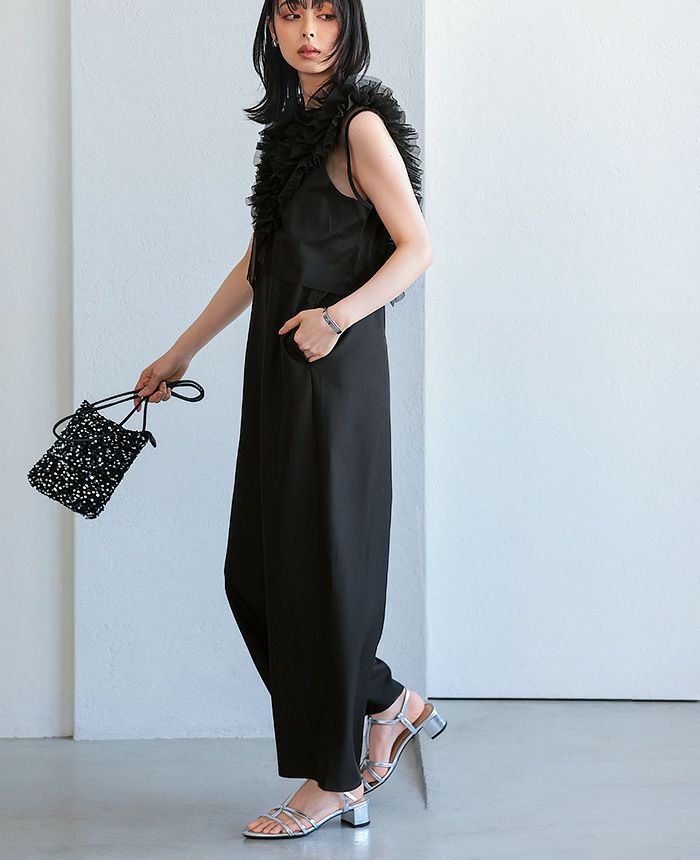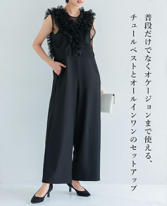 『チュールで華やぐ、大人style。』くしゅっとさせたフリルを贅沢にあしらったシアーのベストと、シンプルなデザインのオールインワンのセットアップ。ベストはフロントのフリルがVになっており、顔周りがスッキリ見えます。後ろネックは涙開きで、同色のボタン付き。オールインワンはウエストと背中がゴムで、楽にメリハリが作れます。普段からオケージョンまで、幅広く使えるアイテムです。
