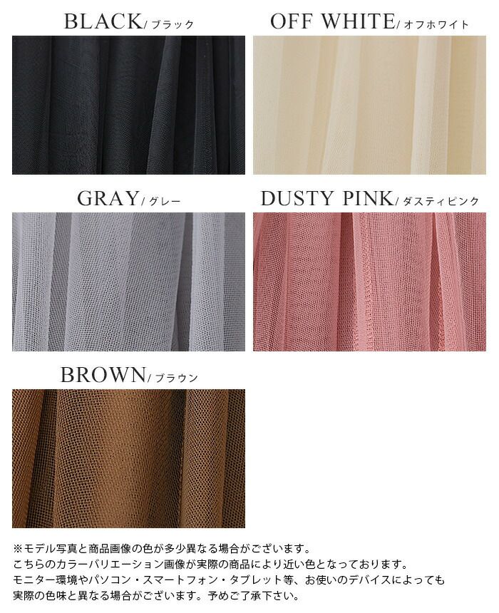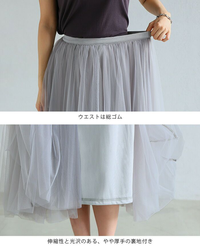 柔らかな、伸縮性のあるチュール ※生地を重ねたデザインの為、静電気が起きる場合は静電気防止スプレーをご使用ください。 |