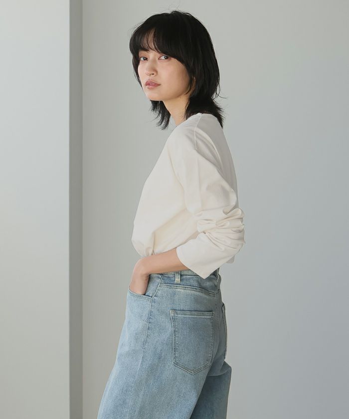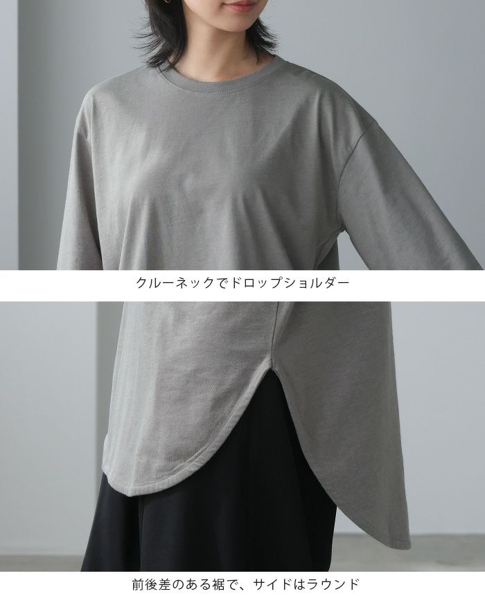 『長く着れるシンプルデザイン。』気になる腰回りをしっかりカバーしてくれる、ロング丈の長袖Tシャツ。シンプルなデザインで、レイヤードにもおすすめです。ゆったりとしたシルエットで着やすく、サイドがラウンドしているのでスッキリ。さらっとした綿生地で肌触りがよく、肌が弱い方も安心して着用いただけます。普段使いにちょうどいい、大人カジュアルアイテムです。