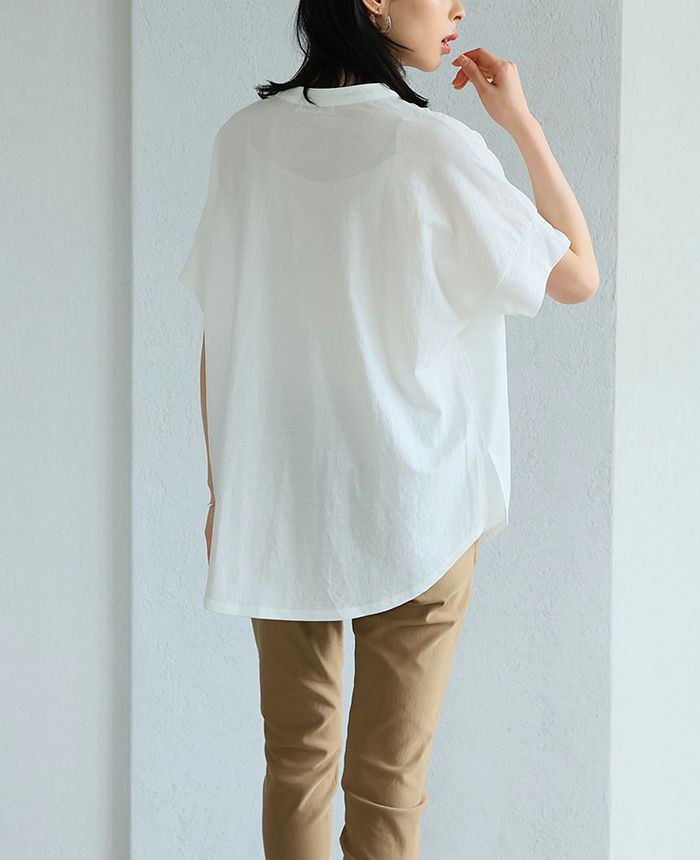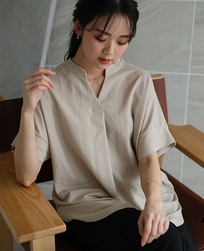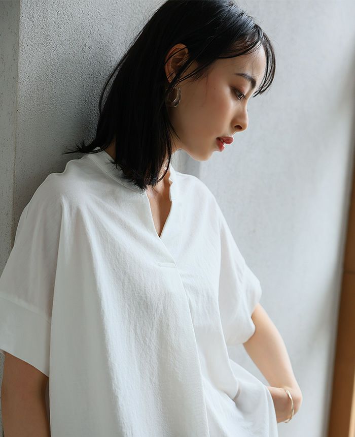 『暑い季節を快適に、接触冷感生地。』 着た瞬間、ひんやりと涼しい着心地が実感できるプルオーバー。スキッパーネックですっきりさせ、胸元のタックでゆったりとしたシルエットに。二の腕が隠れる袖丈とヒップが隠れる着丈で、さり気なく体型カバー。お出掛けが楽しくなる、おすすめの1枚です。