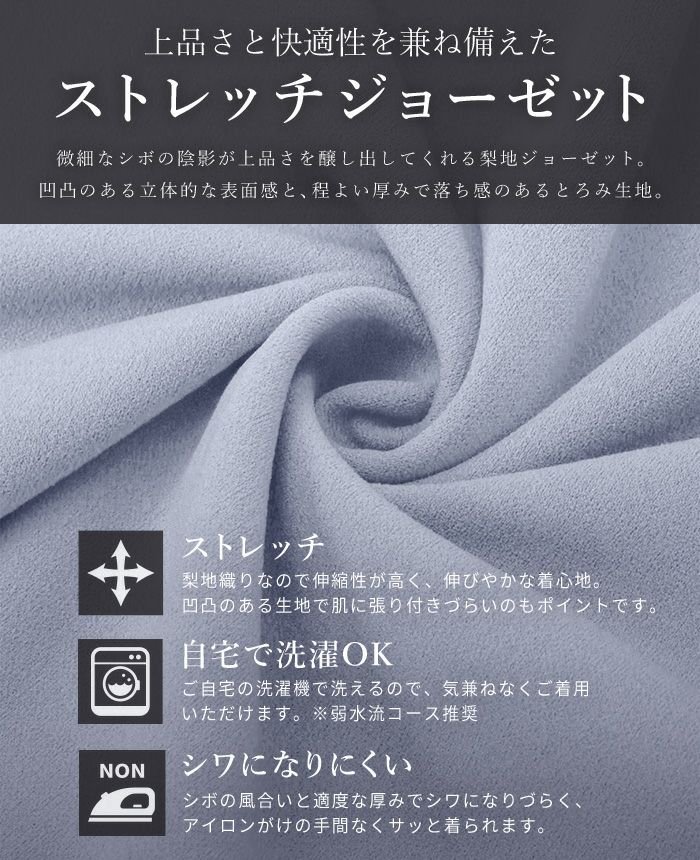 伸縮性がある生地なので着やすく、お手入れしやすいのもポイント。