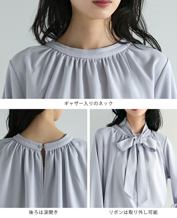 『キレイとラクがこの1枚で叶う。』コーデが華やかに見える、ボウタイ付きのブラウス。取り外しができるので、着こなしの幅が広がります。ネックにギャザーを入れて立体的にし、後ろは同色のボタン付き。伸縮性がある生地なので着やすく、お手入れしやすいのもポイント。普段使いからオケージョンまで活躍してくれるアイテムです。