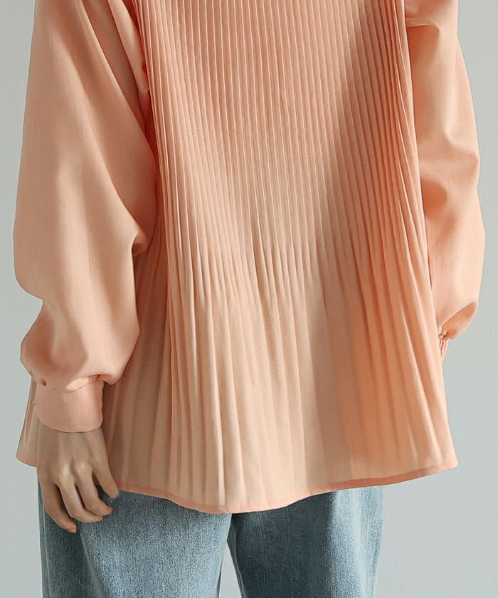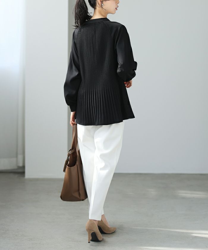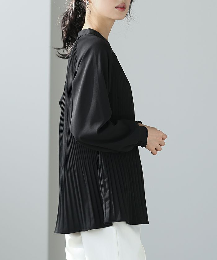 縦ラインを強調し、着やせ効果が期待できるプリーツのブラウス。