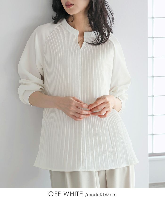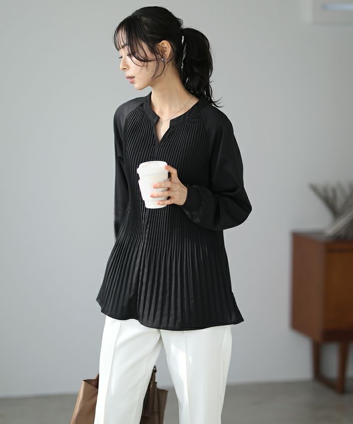 縦ラインを強調し、着やせ効果が期待できるプリーツのブラウス。裾は消しプリーツ加工で、ふわっと広がるフレアシルエット。首元は大人っぽいキーネックで、抜け感のあるデザイン。袖口の内側のシャーリングは、袖を上げるとしっかりキープできます。デイリーからオケージョンまで使える、女性らしいアイテムです。