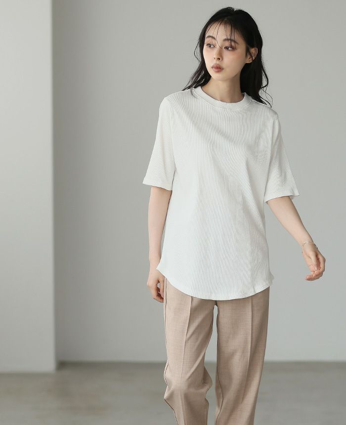 メインにもインナーにも使えるシンプルなTシャツ。リブ編みなので伸縮性が高く、縦のラインを強調するので着やせ効果も期待。二の腕が隠れる袖丈、腰回りが隠せる長めの着丈で体型カバー。さらっとした肌に優しい綿100%のカットソー生地で着心地抜群。1枚は持っておきたい、着回し上手なアイテムです。