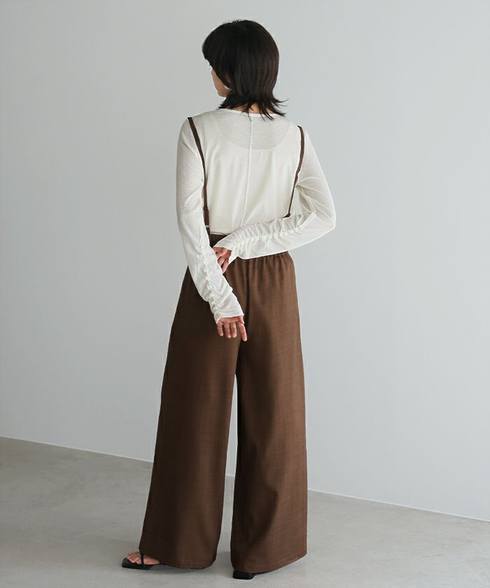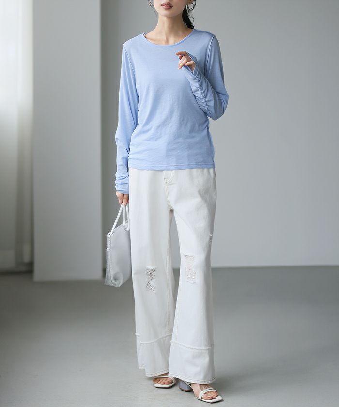 『着回しできるシンプルアイテム。』袖の内側をゴムでクシュっとさせたトップス。どんなアイテムにも合わせやすいシンプルなデザイン。透け過ぎないので、シアーが苦手な方にもおすすめ。伸縮性の高い生地で、ストレスなく着用いただけます。メインからレイヤードまで、幅広く活躍してくれるアイテムです。