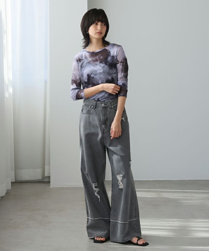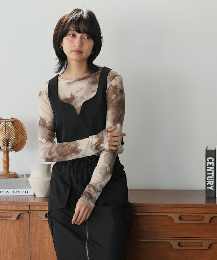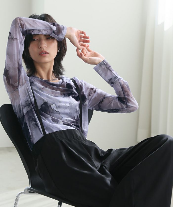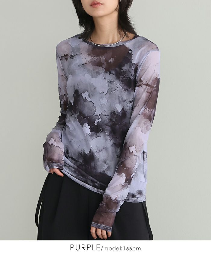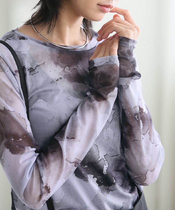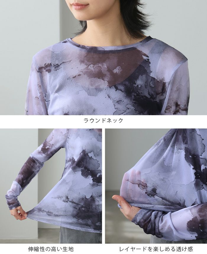 独特なペイント柄で個性的なお洒落が楽しめる、シアーのトップス。シンプルなデザインなので、どんなアイテムにも合わせられます。程よい透け感は、肌の露出が苦手な方にもおすすめ。伸縮性が高く、着心地がいいネット生地を使用。メインだけでなく、インナーとしても活躍してくれるアイテムです。