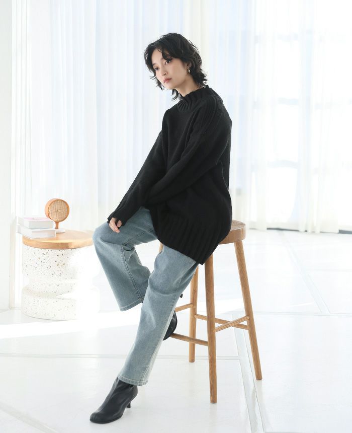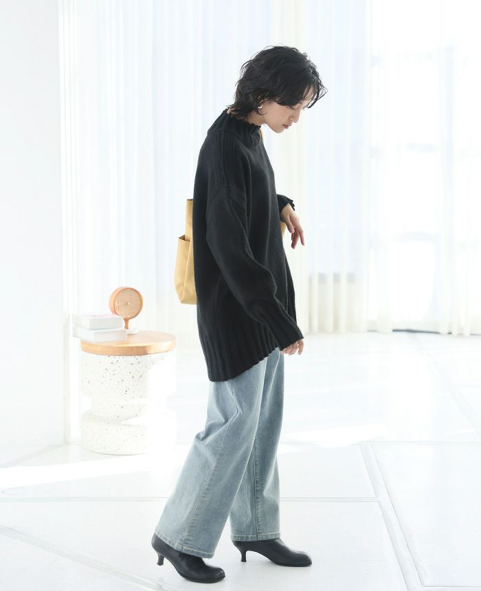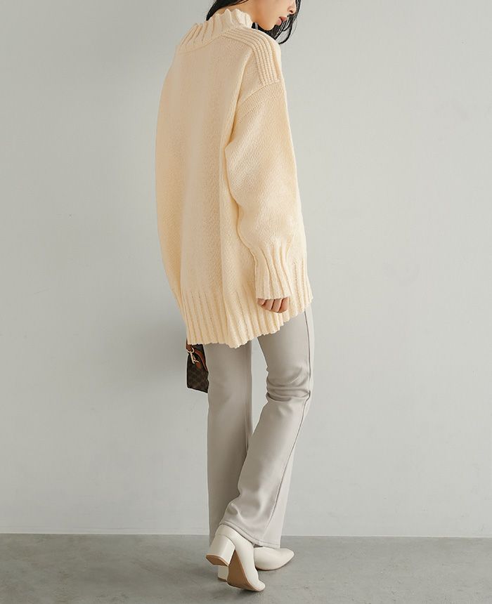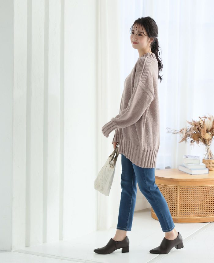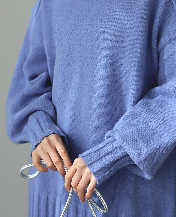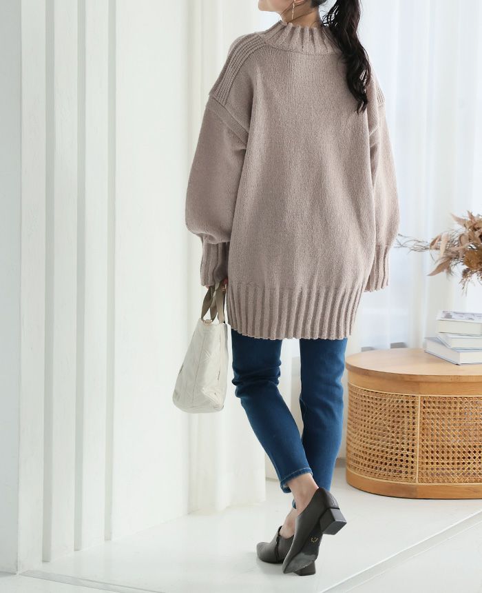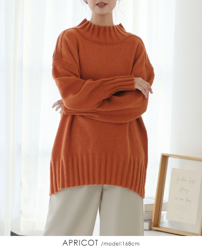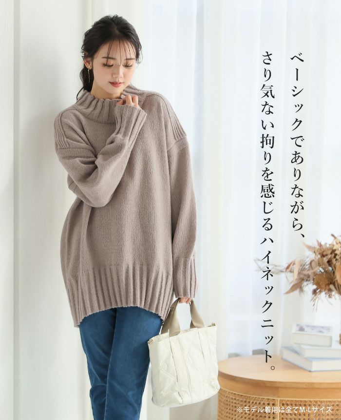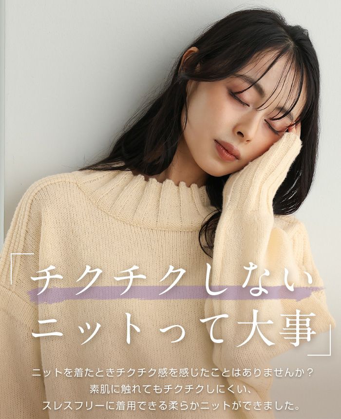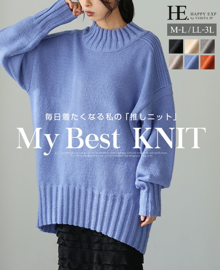 『理想のニットに出会った。』ボディーラインをカバーしてくれる、ゆったり着れるデザイン。首元が苦しくないネックで、顔周りがスッキリ見えます。ネック、袖口、裾の長めのリブが、全体を引き締めてくれます。前後差のある長めの着丈で、気になる下半身をカバー。色違いで揃えてみたくなる、おすすめのアイテムです。