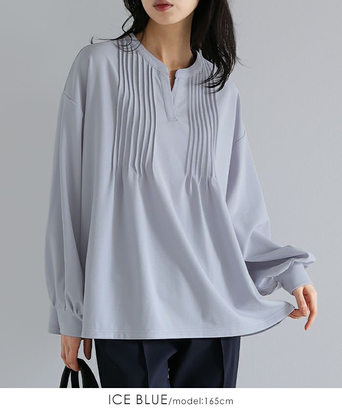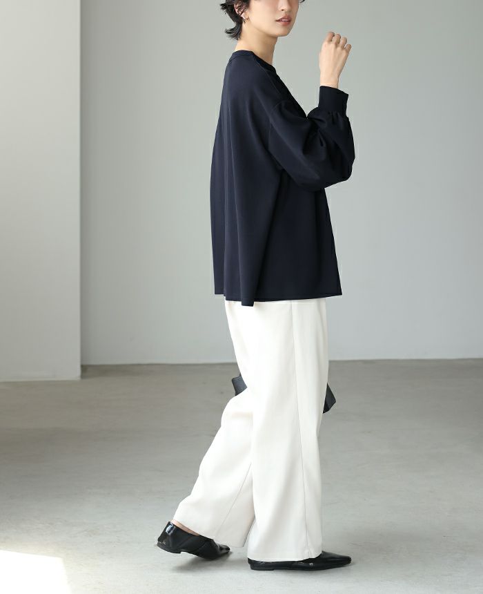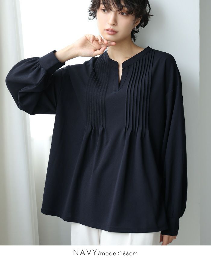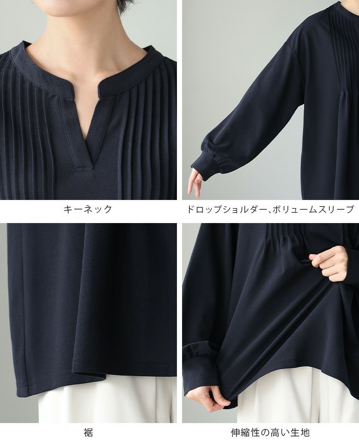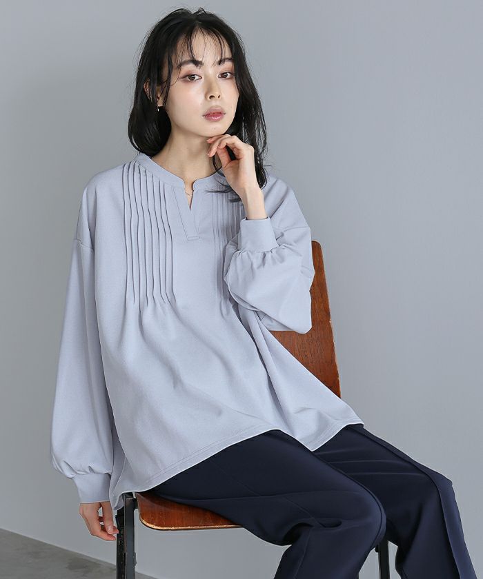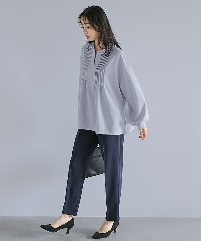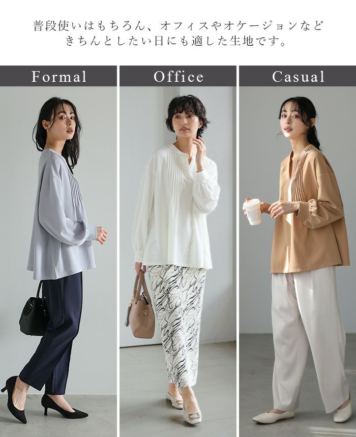 『きちんと見える、ゆったりブラウス。』 胸元にピンタックを入れた、ふわっと広がるデザイン。首元がスッキリ見えるスキッパーネックと、ボリュームのある袖で女っぽく仕上げました。伸縮性がある生地なので着やすく、お手入れしやすいのもポイント。普段使いからオケージョンまで活躍してくれるアイテムです。