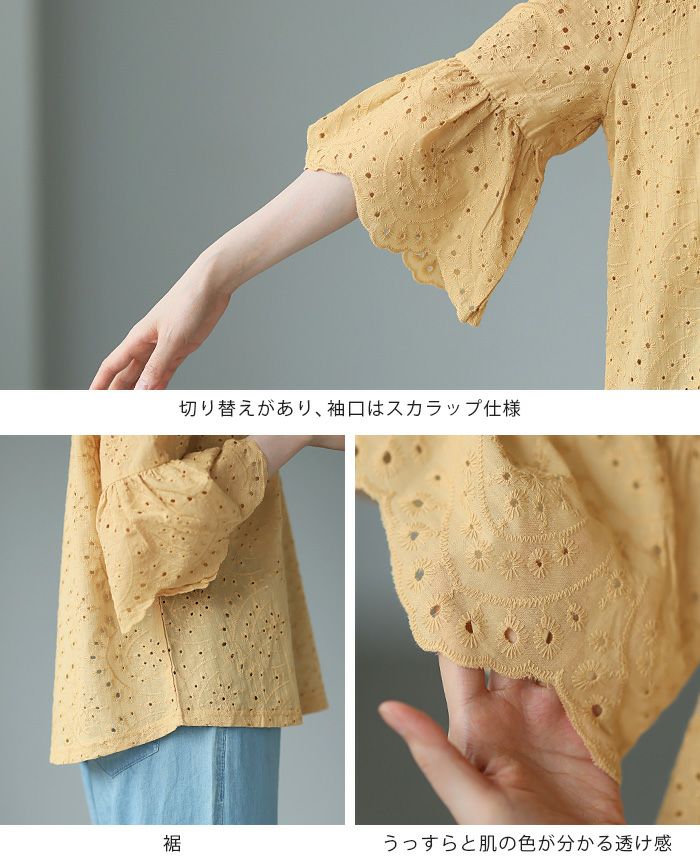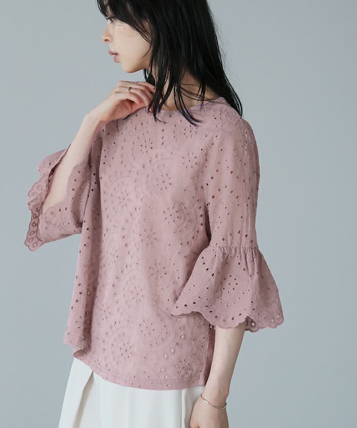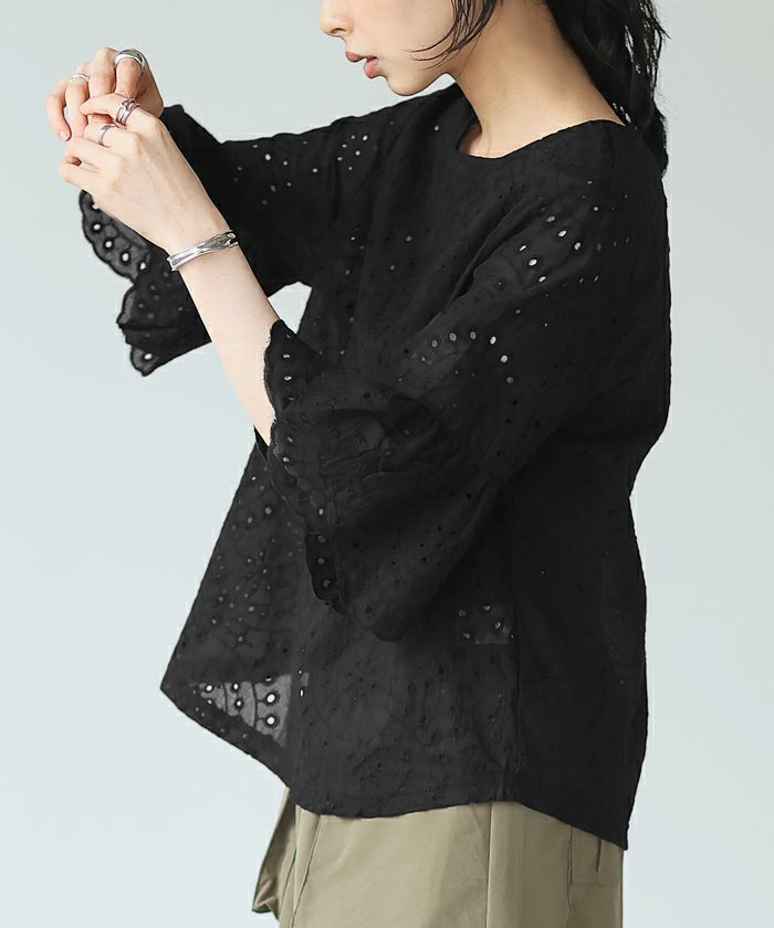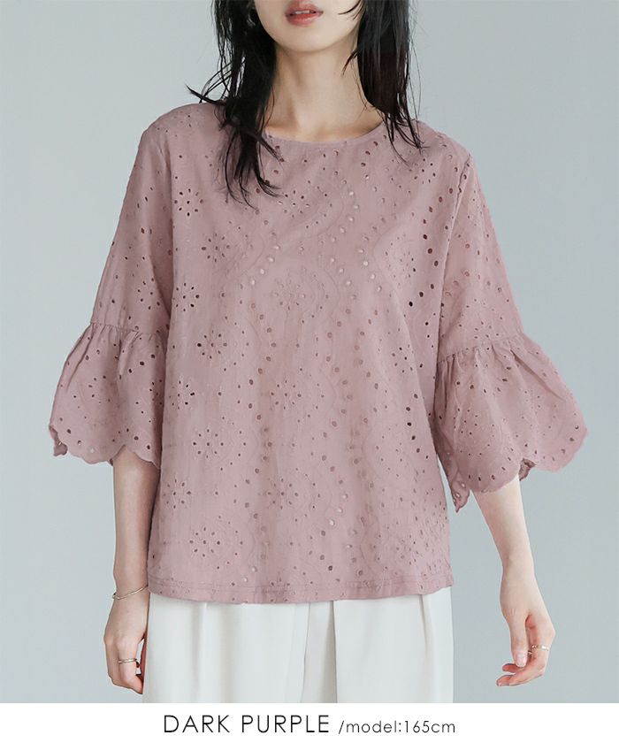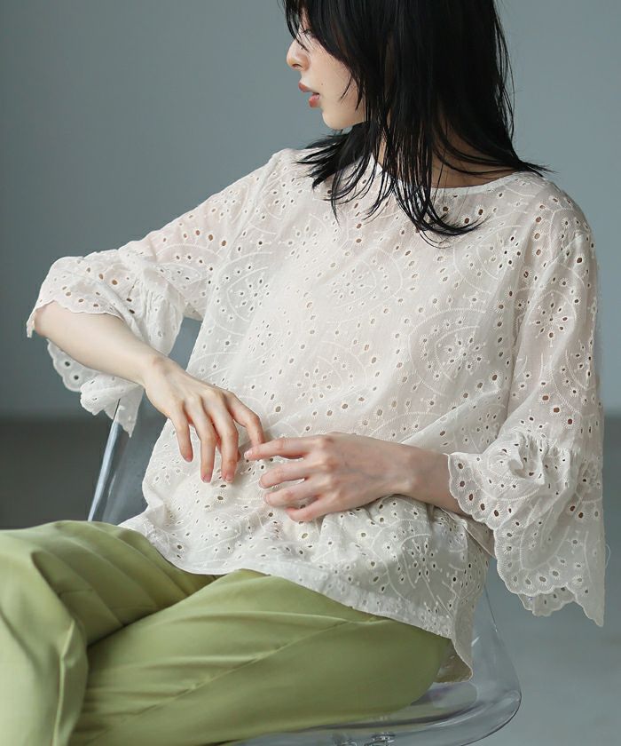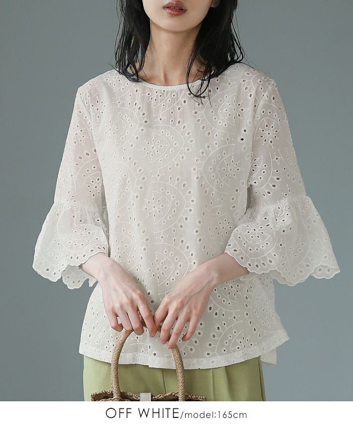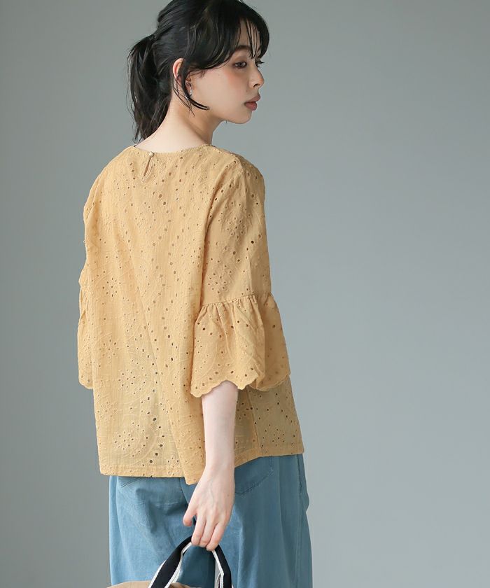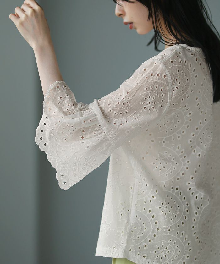『綿100%の優しい肌触り。』穴の周りをかがり刺繍した、アイレットレースのブラウス。袖は二の腕が隠れる長さで、袖口はニュアンスが出るスカラップレース仕上げ。やや狭めのネックは後ろを涙開きにし、同色のボタン付き。さらっとした綿100%の生地で通気性が良く、暑い時期も快適。コーデを華やげてくれる、大人可愛いアイテムです。