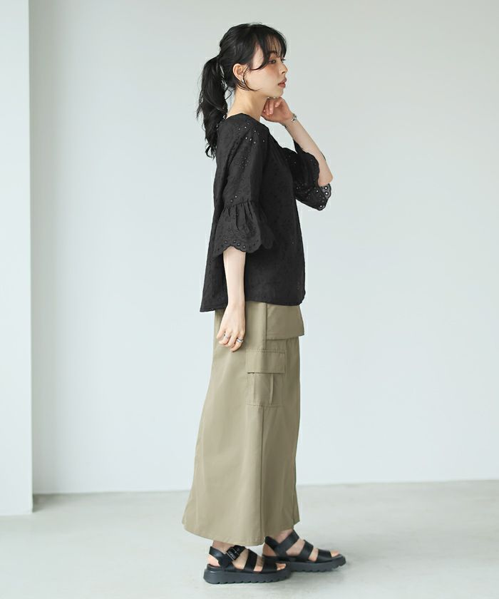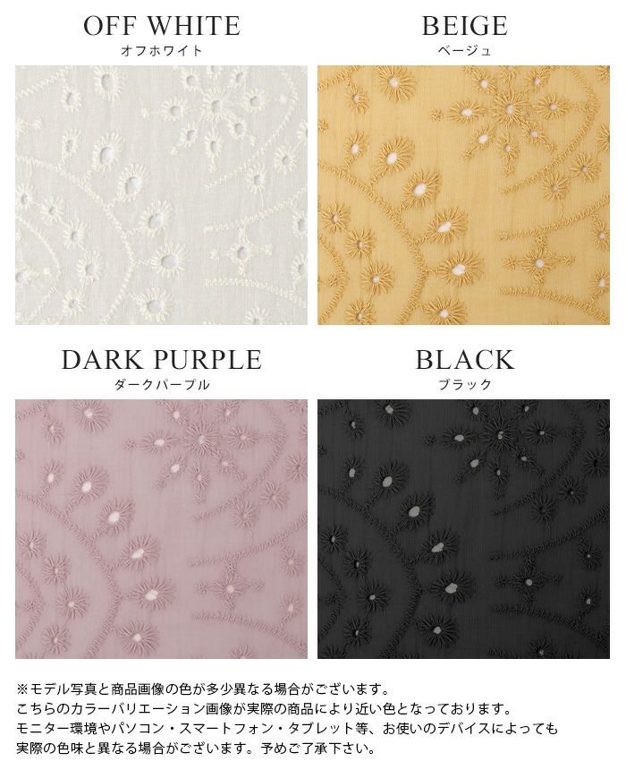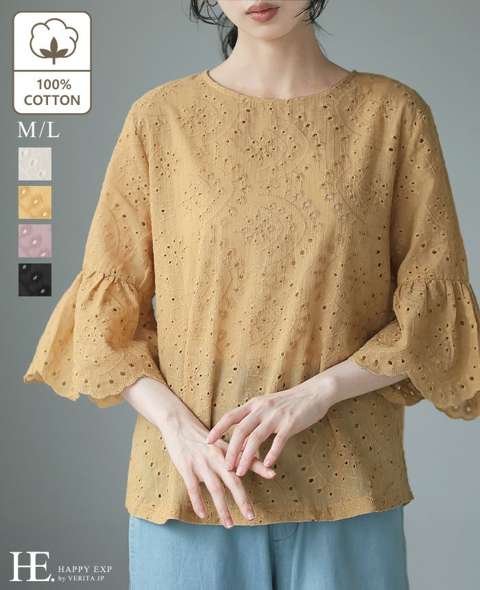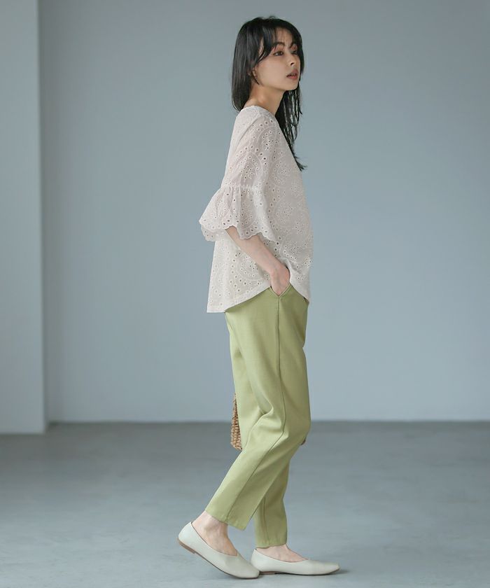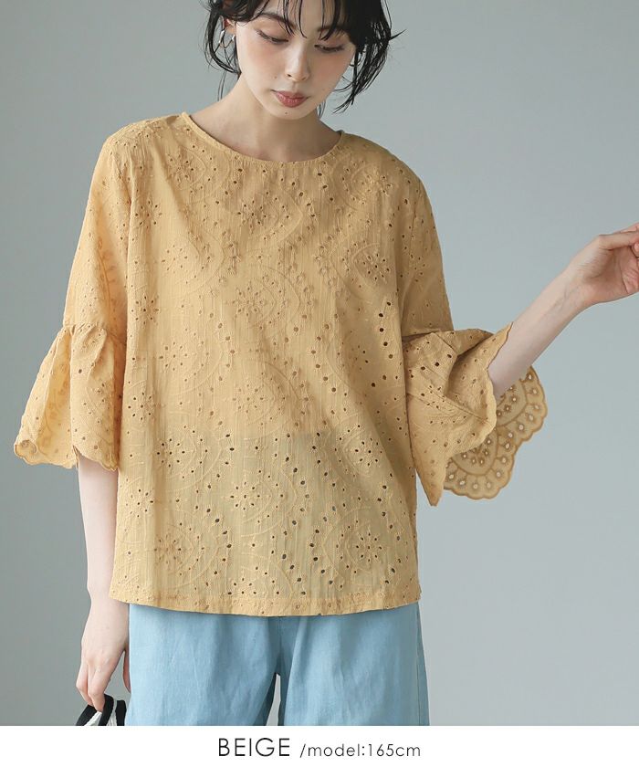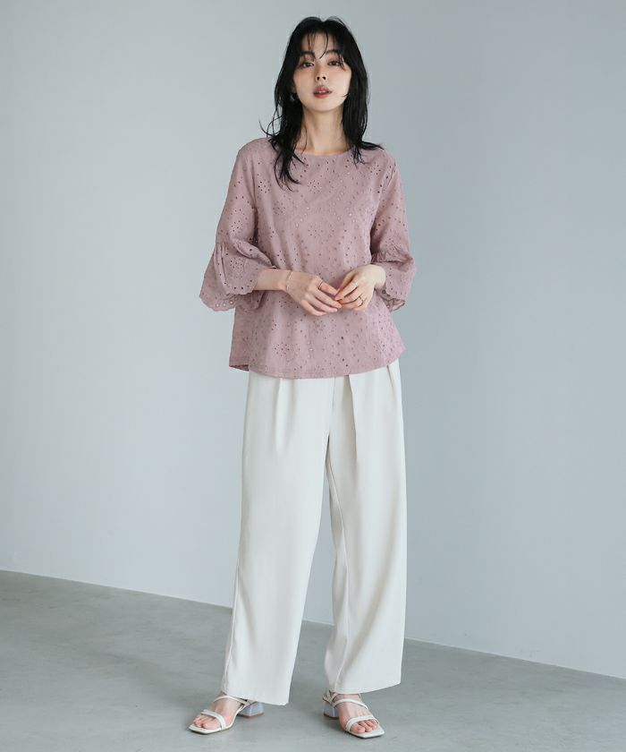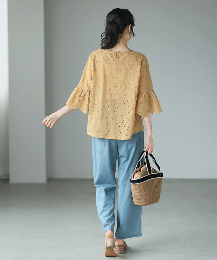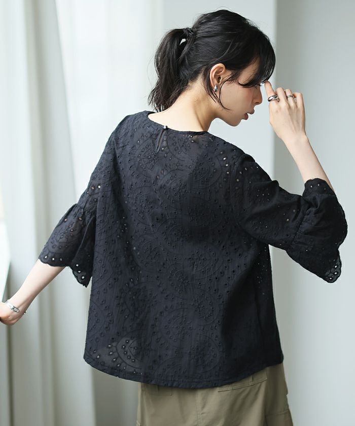 『綿100%の優しい肌触り。』穴の周りをかがり刺繍した、アイレットレースのブラウス。袖は二の腕が隠れる長さで、袖口はニュアンスが出るスカラップレース仕上げ。やや狭めのネックは後ろを涙開きにし、同色のボタン付き。さらっとした綿100%の生地で通気性が良く、暑い時期も快適。コーデを華やげてくれる、大人可愛いアイテムです。