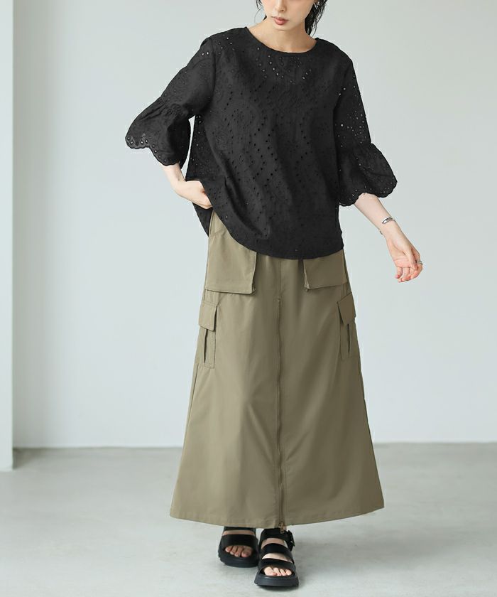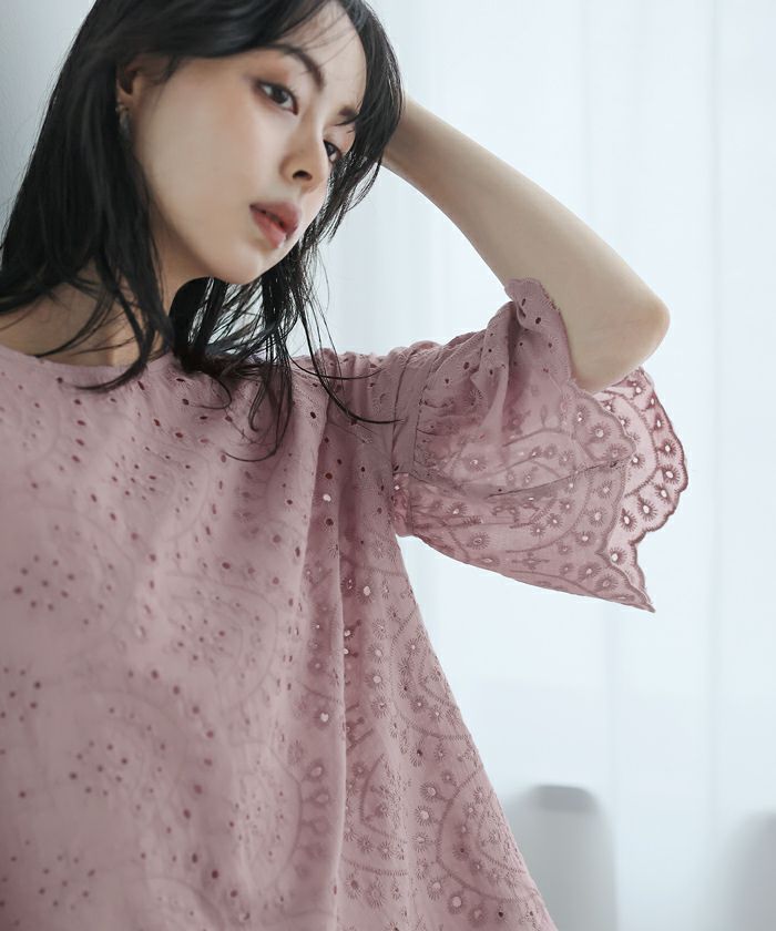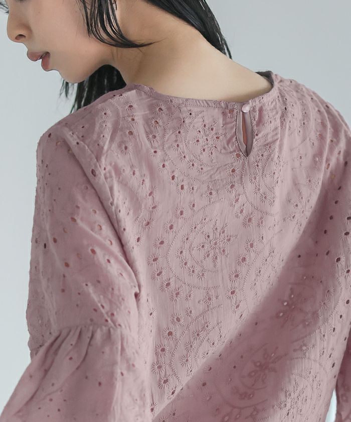 穴の周りをかがり刺繍した、アイレットレースのブラウス。