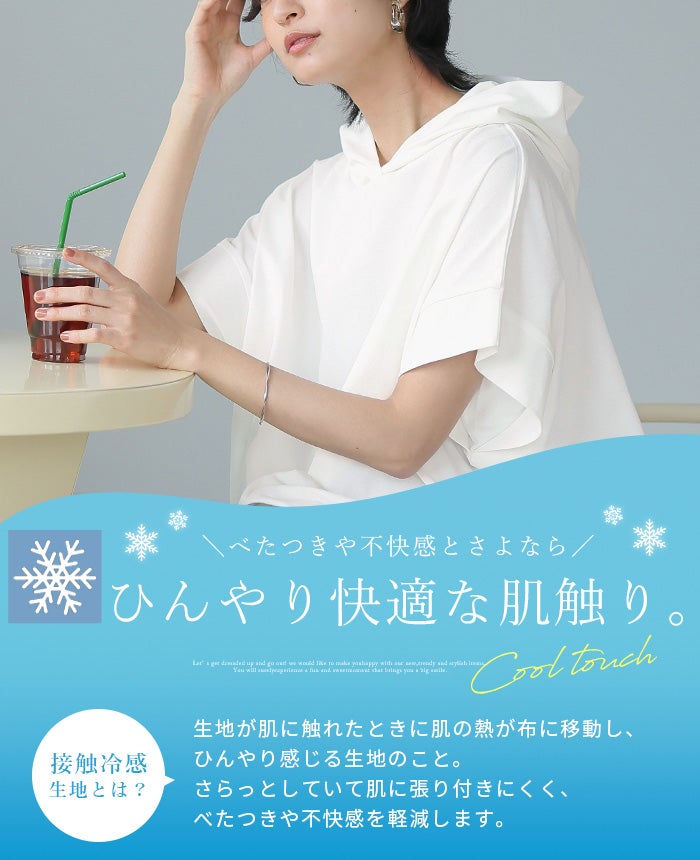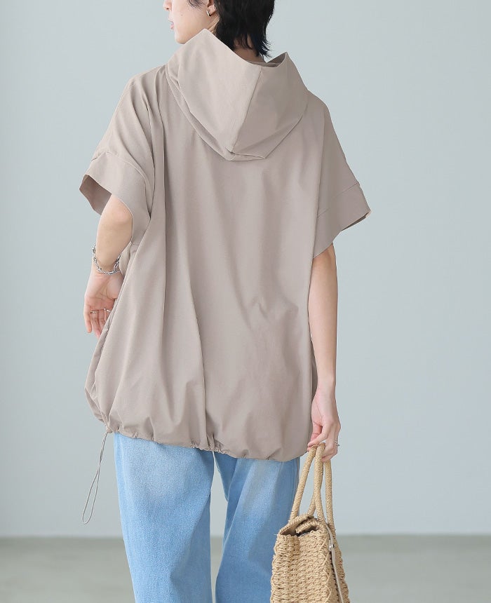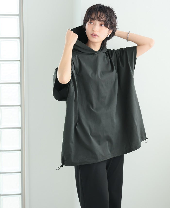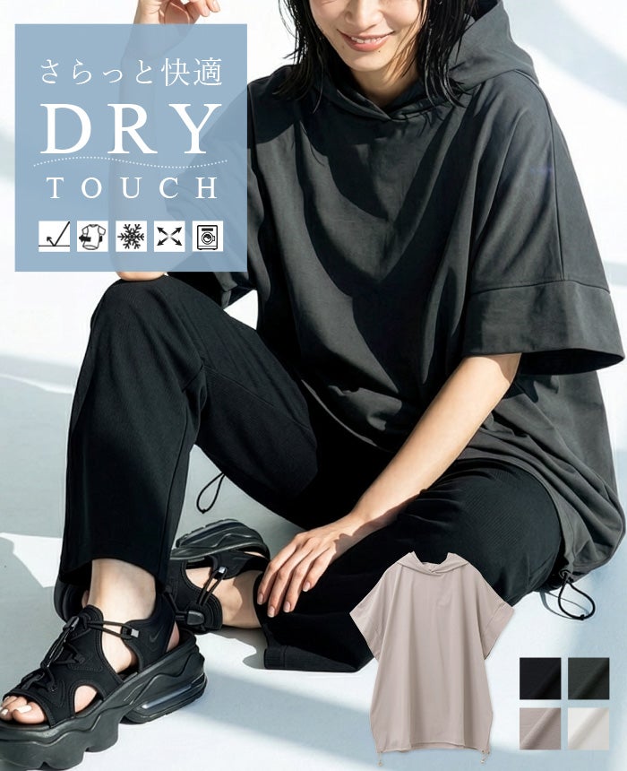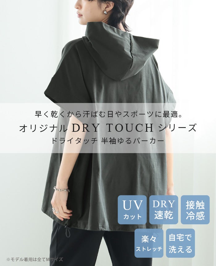 『汗ばむ季節に嬉しい機能性アイテム!』汗をかいてもすぐに乾く、ドライタッチシリーズが登場。紫外線カットや接触冷感の機能付きで、スポーツやお出掛けも安心。ゆったりとした、リラックス感のある半袖のパーカー。裾の両サイドに付けたゴムのドロストで、お好きなシルエットが楽しめます。袖口は広く、気になる二の腕をカバー。1枚は持っておきたい、おすすめのアイテムです。