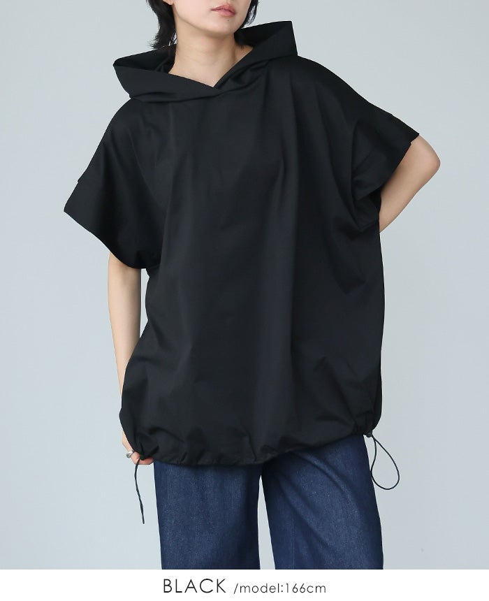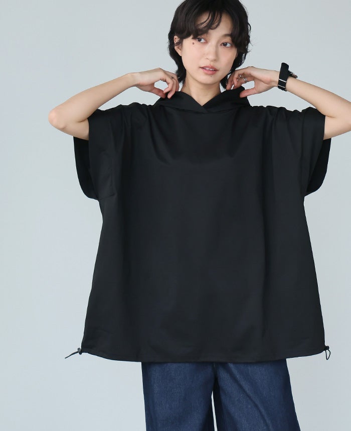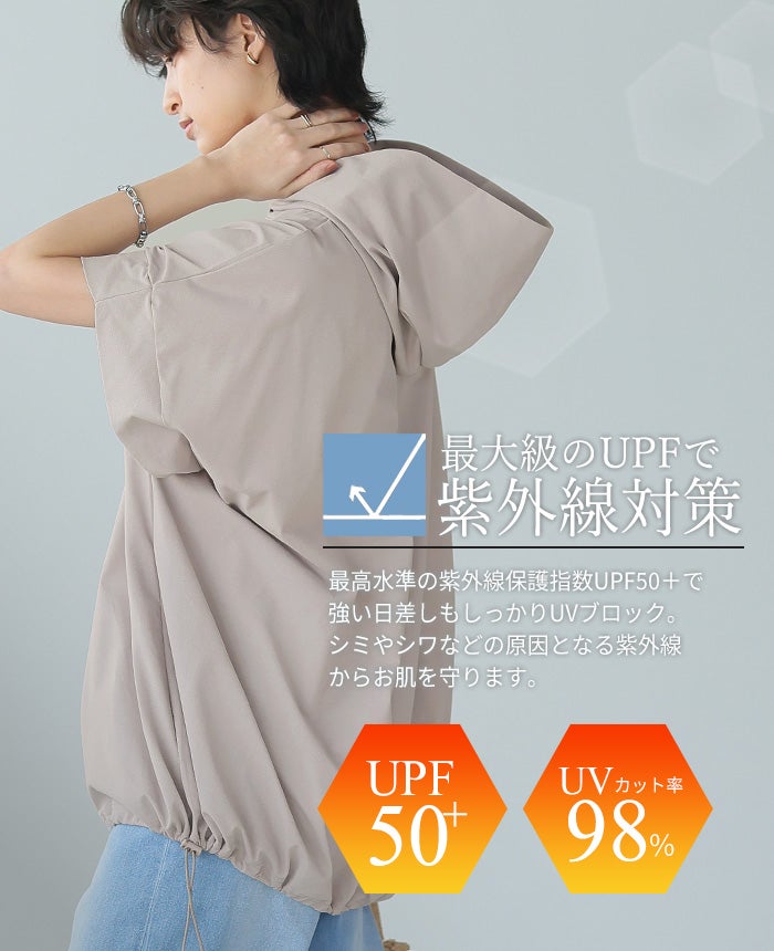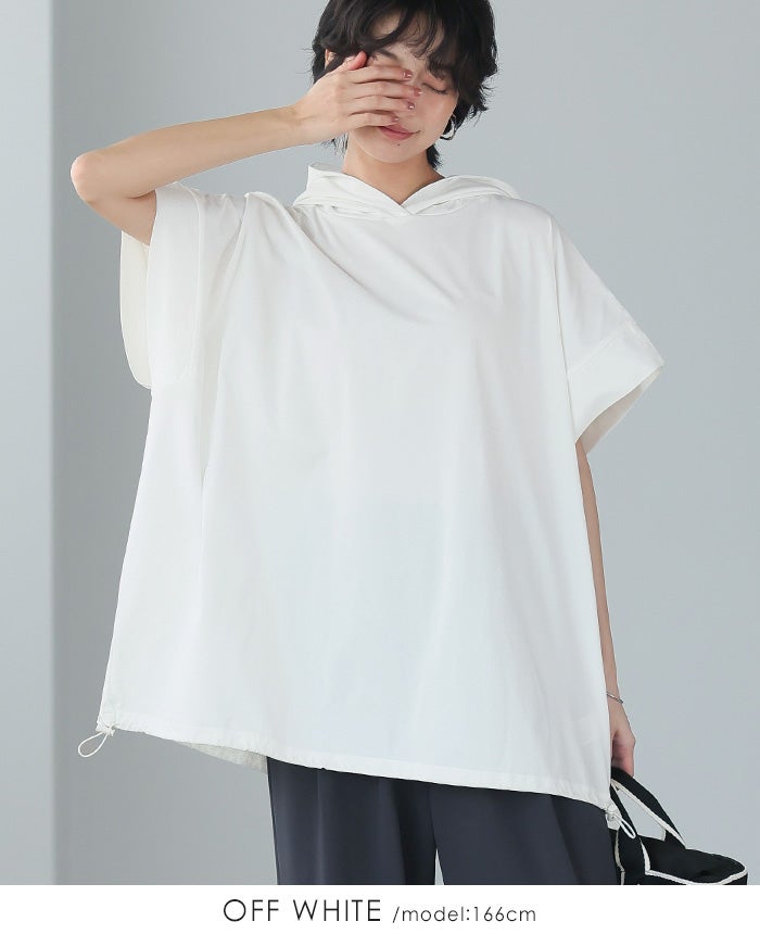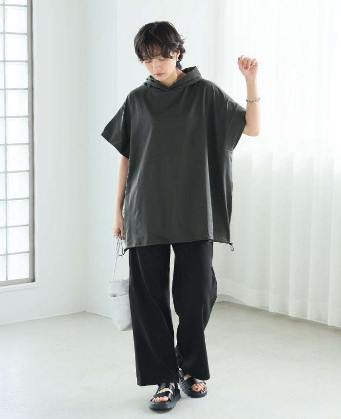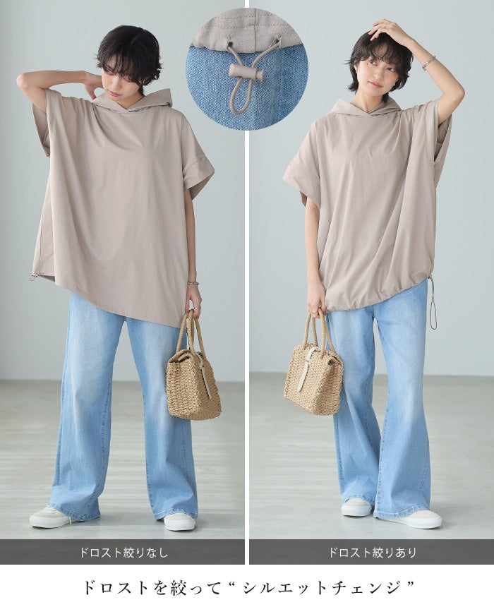 『汗ばむ季節に嬉しい機能性アイテム!』汗をかいてもすぐに乾く、ドライタッチシリーズが登場。紫外線カットや接触冷感の機能付きで、スポーツやお出掛けも安心。ゆったりとした、リラックス感のある半袖のパーカー。裾の両サイドに付けたゴムのドロストで、お好きなシルエットが楽しめます。袖口は広く、気になる二の腕をカバー。1枚は持っておきたい、おすすめのアイテムです。