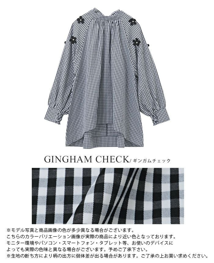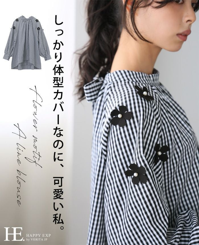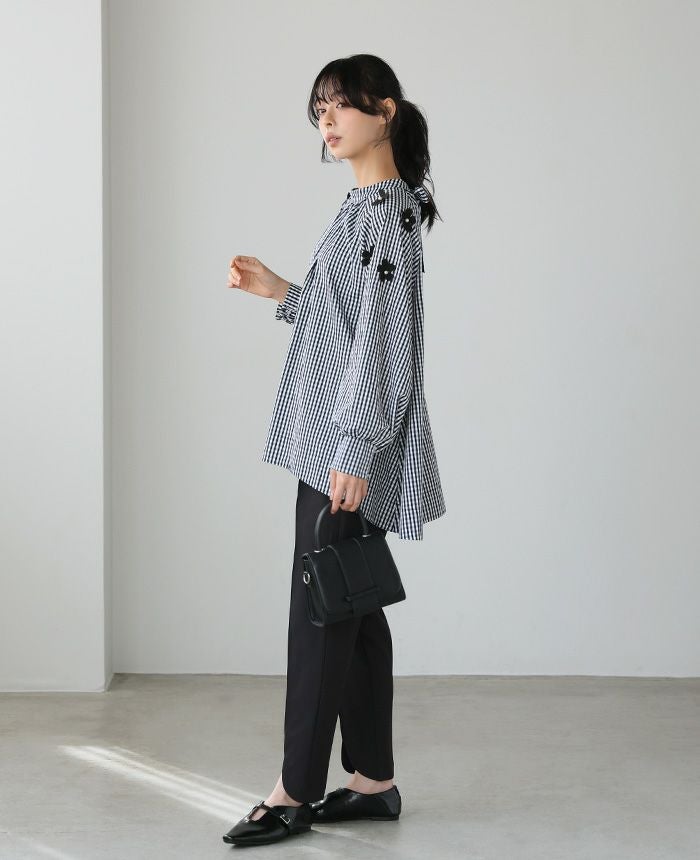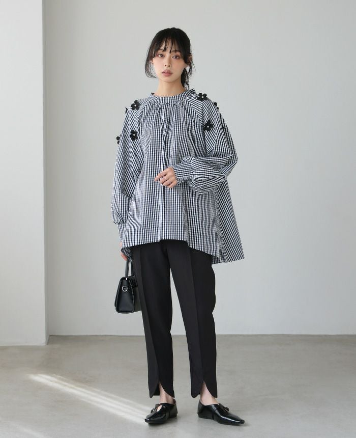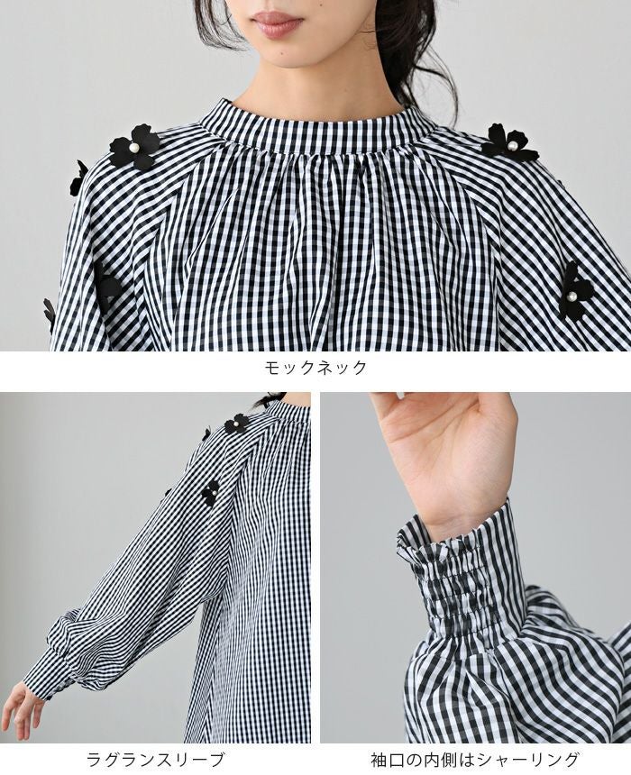 『日常が華やぐ、立体的な花。』立体的な花のモチーフを散りばめ、パールで飾り付けしたブラウス。たっぷりと生地を使ったAラインで、気になる腰回りをカバー。ギャザーを入れたモックネックは、後ろでリボンを結ぶデザイン。袖口は内側にシャーリングを入れ、ふっくらとしたボリュームスリーブ。大人の可愛さが詰まった、拘りのアイテムです。
